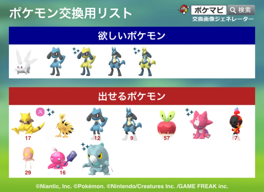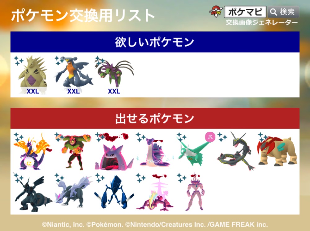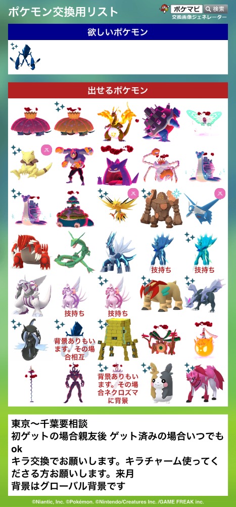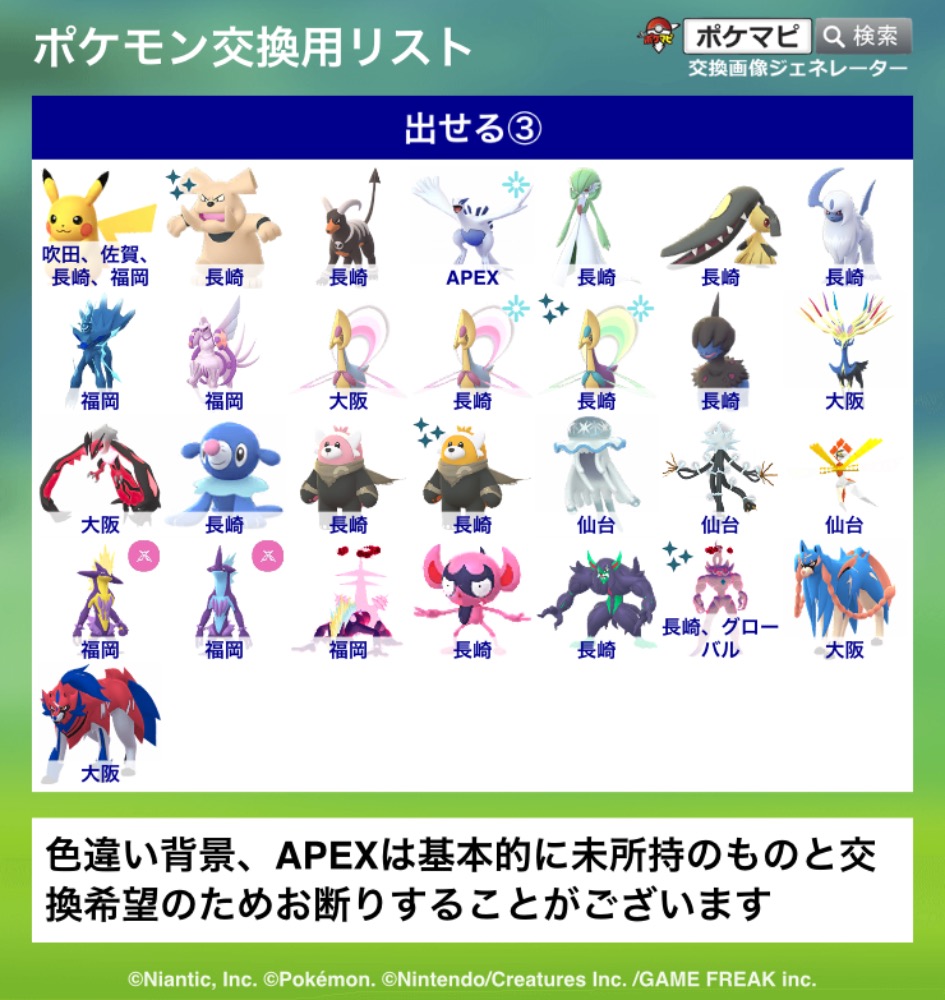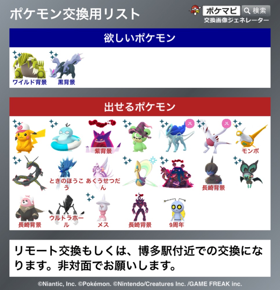 | コメント | ✨️交換リストを更新しました✨️ 画像のポケモンを探しています。 GOフェスト東京にも参加予定です。(道中大阪によります。そこでも可能) 普段は鳥取でポケ活してます。 他にも色違いやサイズ系出せますので交換相談宜しくお願いしますm(__)m |
