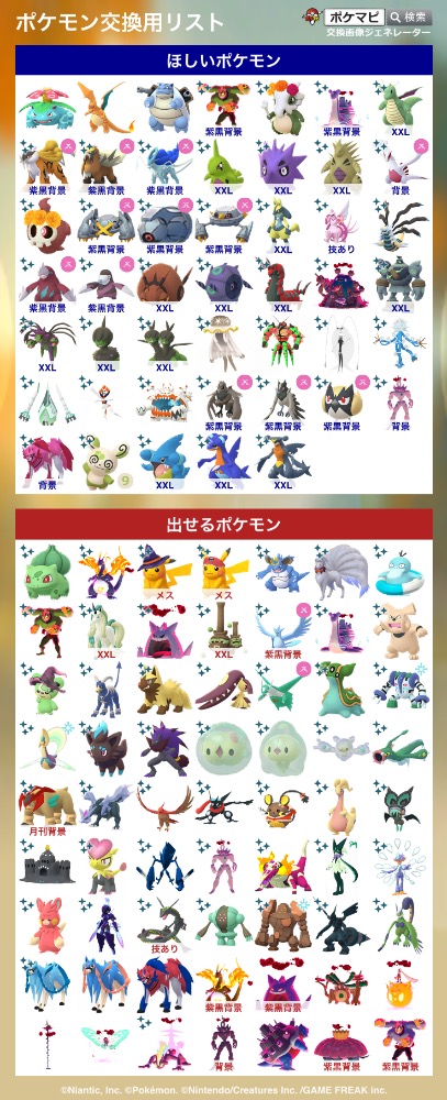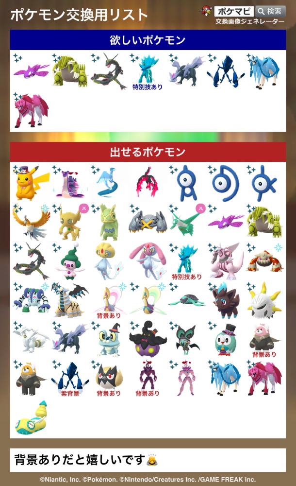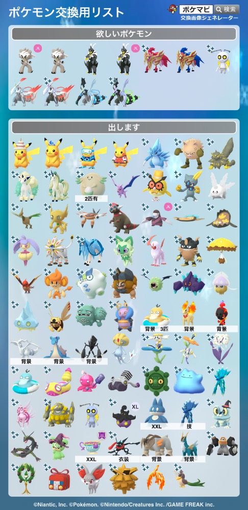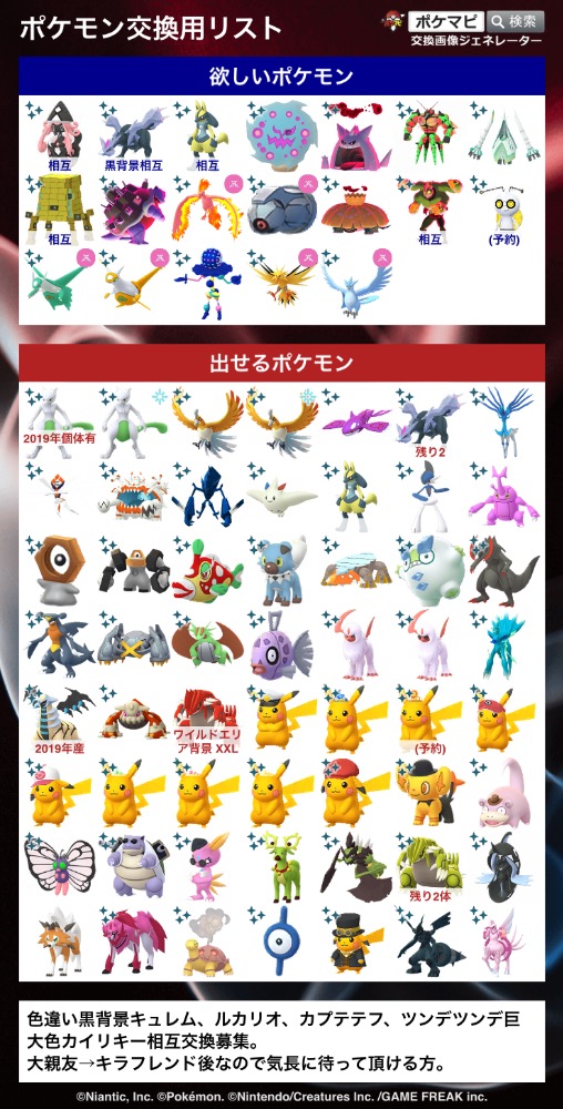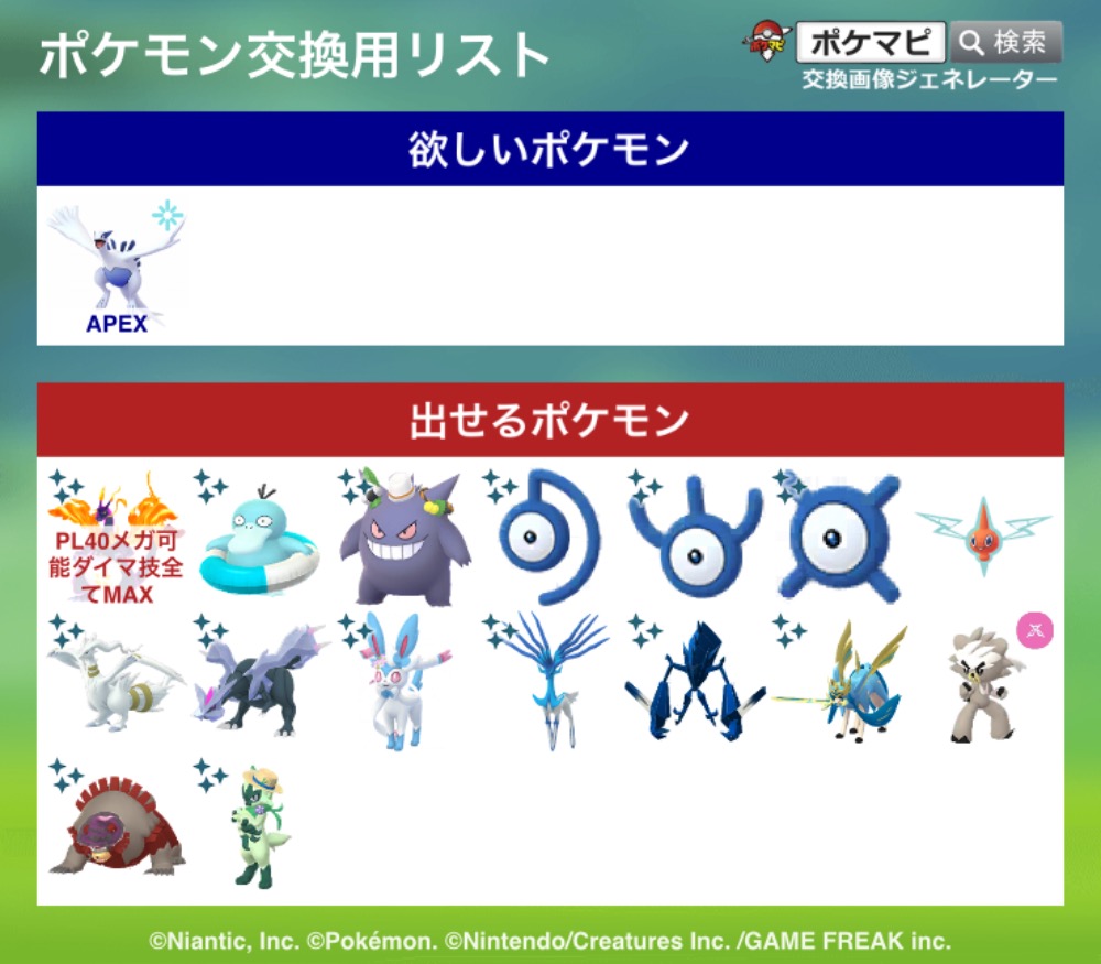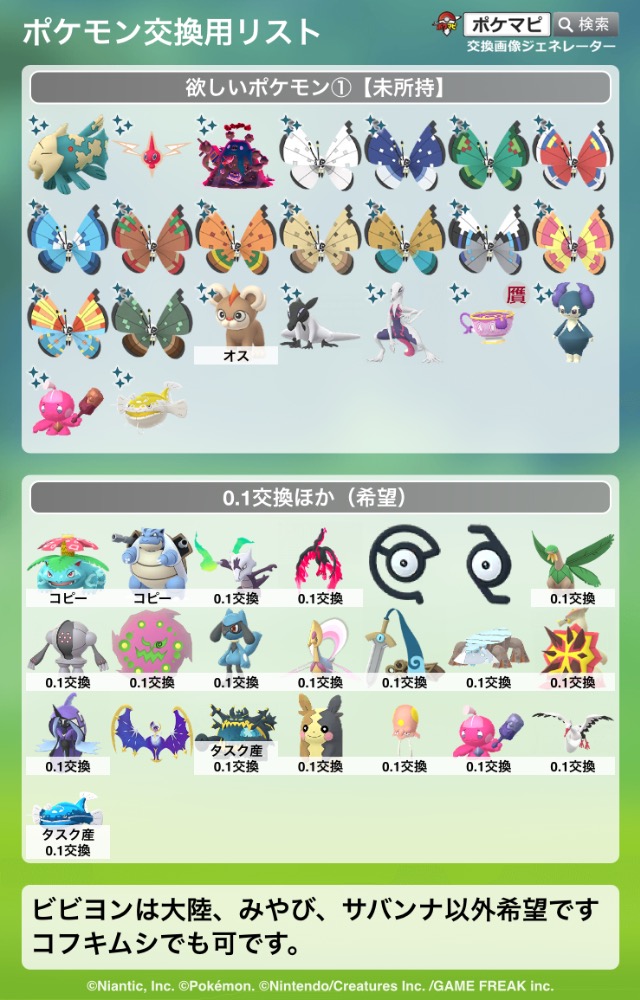 | コメント | ✨️交換リストを更新しました✨️ 画像のポケモンを探しています。 GOフェスト東京にも参加予定です。(道中大阪によります。そこでも可能) 普段は鳥取でポケ活してます。 他にも色違いやサイズ系出せますので交換相談宜しくお願いしますm(__)m |