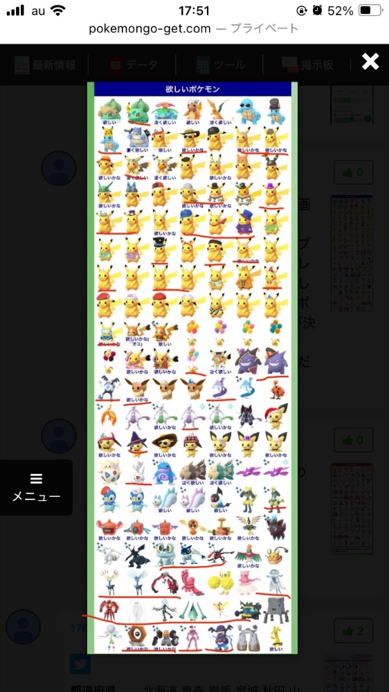 | コメント | お気軽にコメントください!ぜひよろしくお願いします!ボールはモンスターボールorプレミアボールorマスターボールだと嬉しいです! |