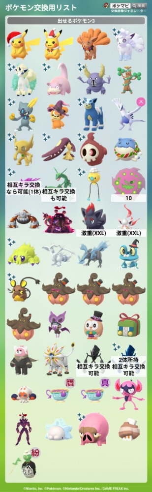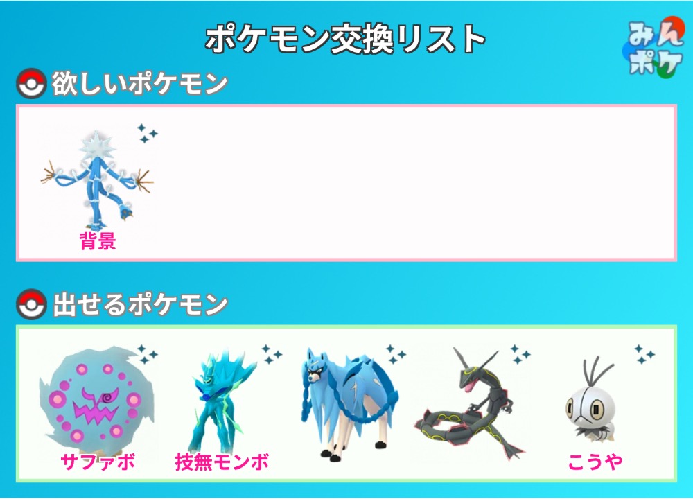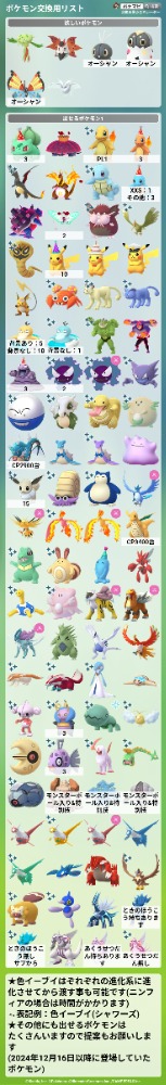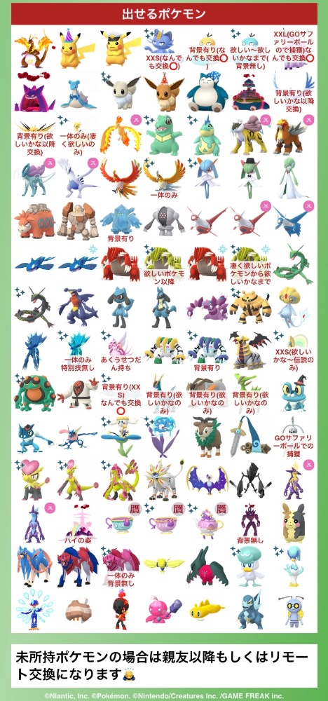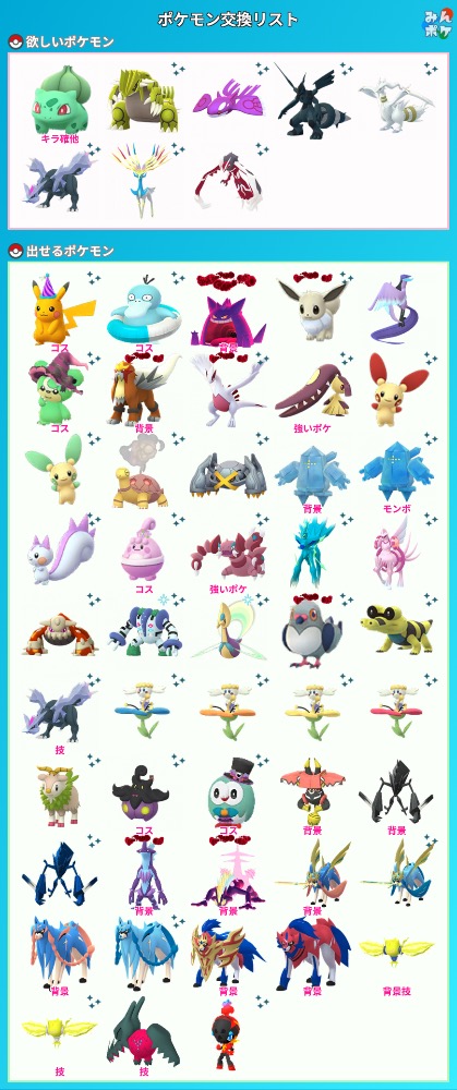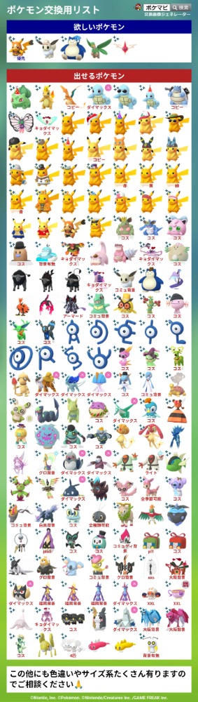 | コメント | 対面、非対面、リモートOK! キラフレでチャーム出たら使用します! 以前の投稿を消してしまったので再投稿です。 記載されているポケモン以外でもいたら渡しますので相談ください。 |