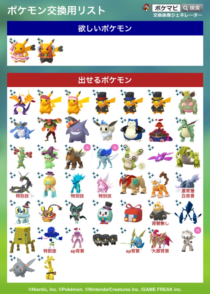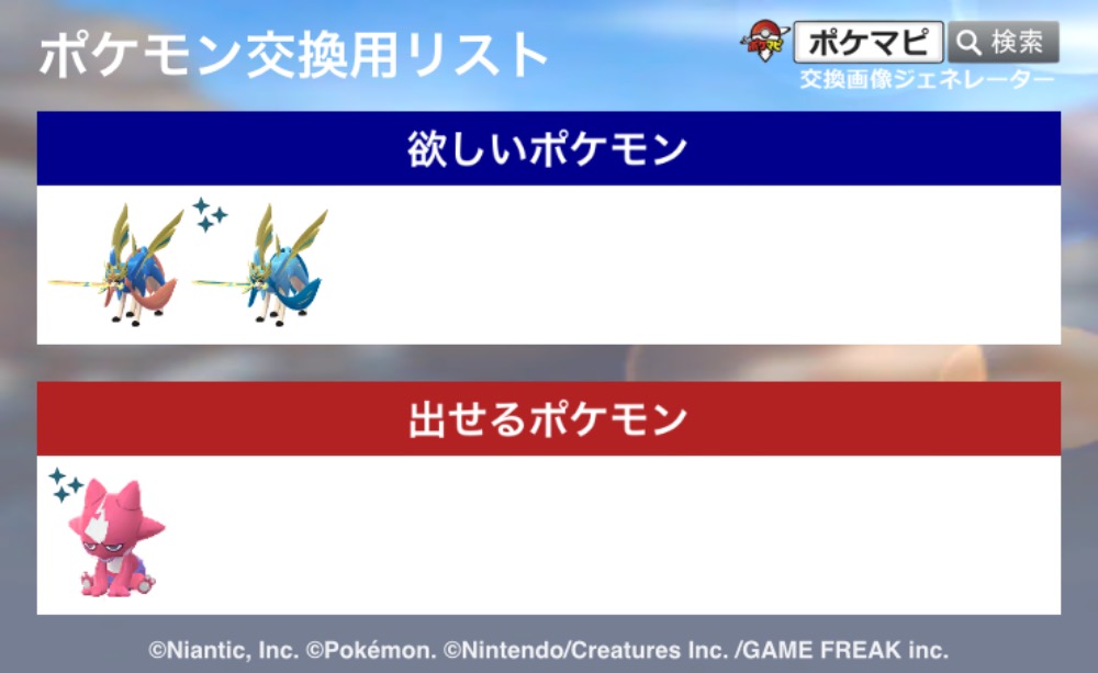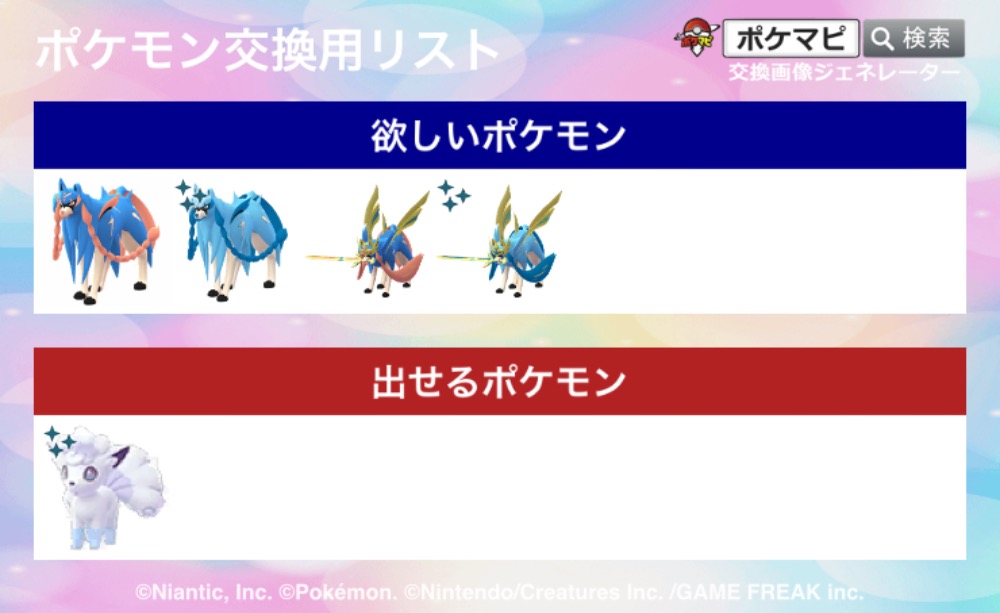 | コメント | ザシアンザマゼンタはエナジーなしで変身可能個体のみ。 背景付きは居ません。 対面のみ可能です。 連絡手段はキャンプファイヤーなど様々可能。 |