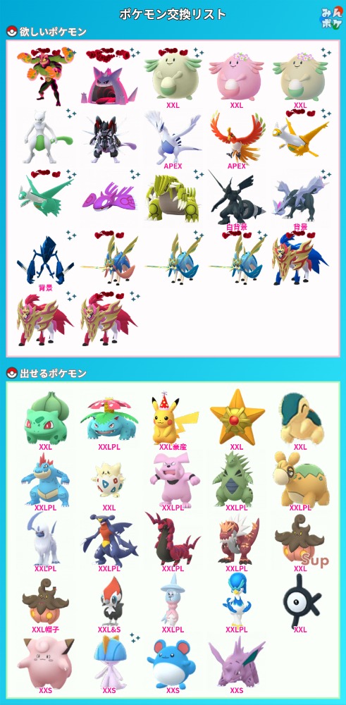 | 出せるポケモン | ポケモンXXL又はXXS 画像でご確認ください🙏 PLは最低36 最高44です 2枚目は特にXXL等はありません |