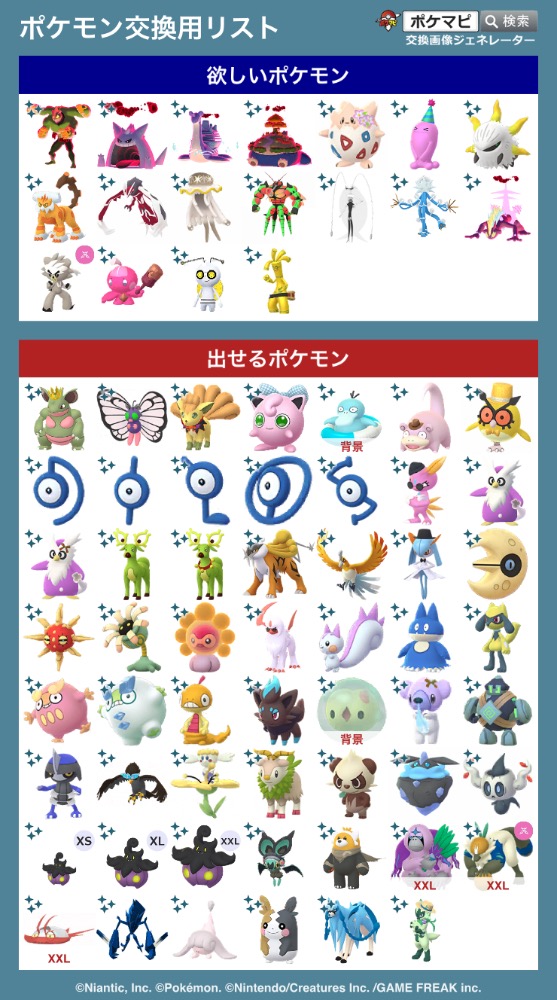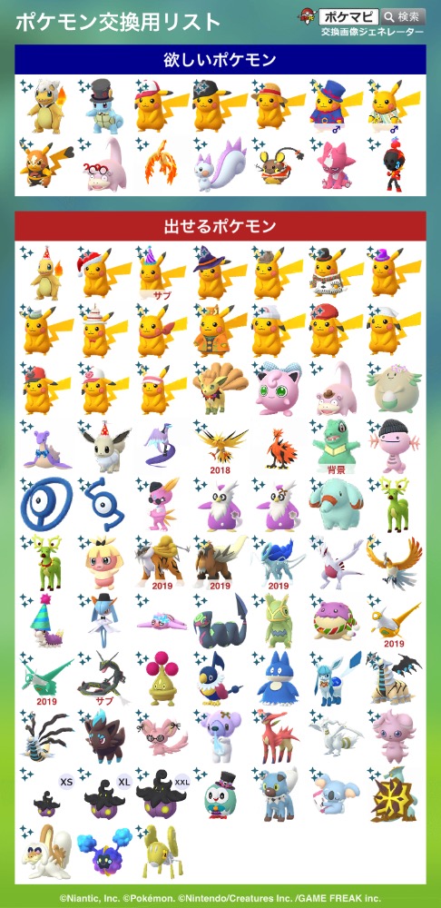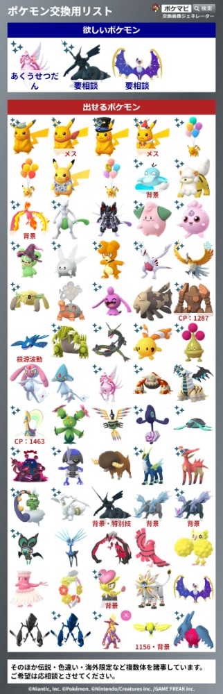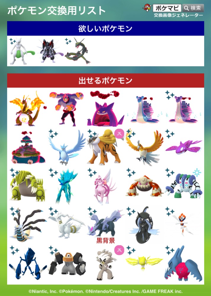 | 出せるポケモン | 色背景ネクロズマ 色クレセリア(2019産) アーマードミュウツー(2019産) 色ゼルネアス ザマゼンタ(XXL) 色ザシアン(けんのおう、CP5505)←これは複数との交換のみです その他諸々の伝説、色伝説 |