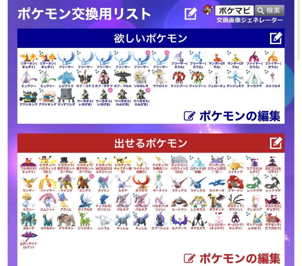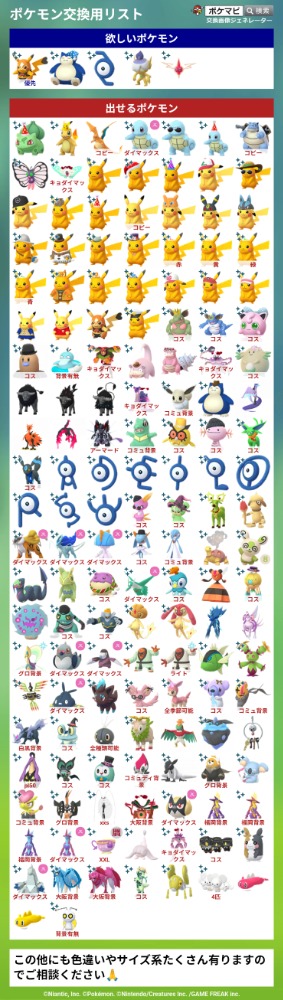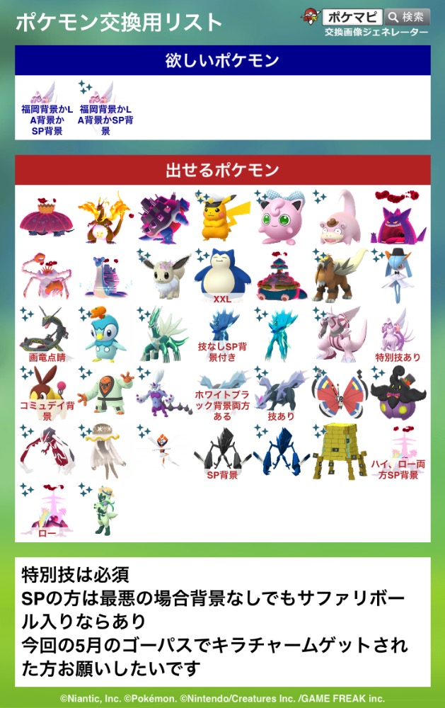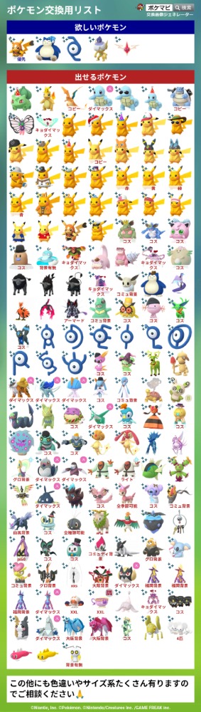 | 欲しいポケモン | 載っているポケモンであればなんでも良いです。※載っているポケモンで色違い持っていて交換出来る場合は載ってないポケモンでも構いません。100%出せるか分かりません |