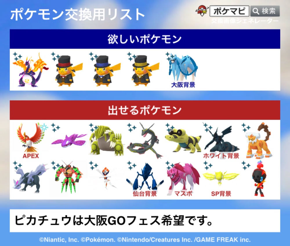 | コメント | 画像のポケモンを探しています。 GOフェスト東京にも参加予定です。(道中大阪によります。そこでも可能) 普段は鳥取でポケ活してます。 他にも色違いやサイズ系出せますので交換相談宜しくお願いしますm(__)m TwitterMyu_yy |