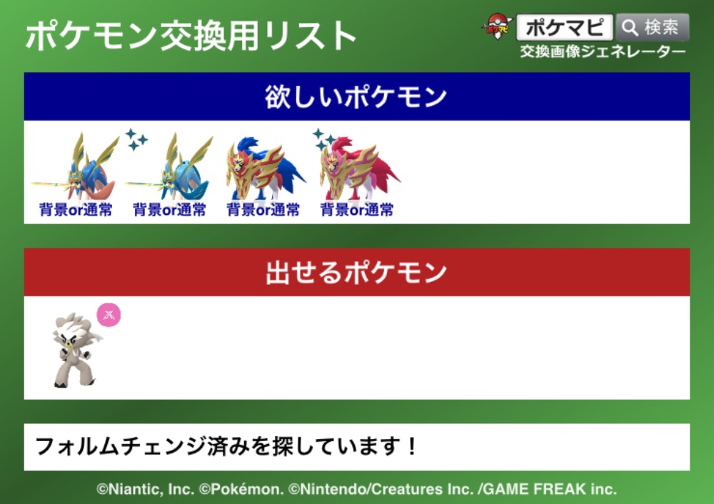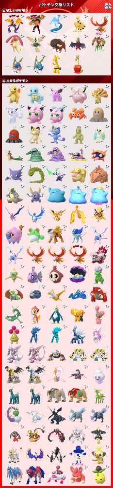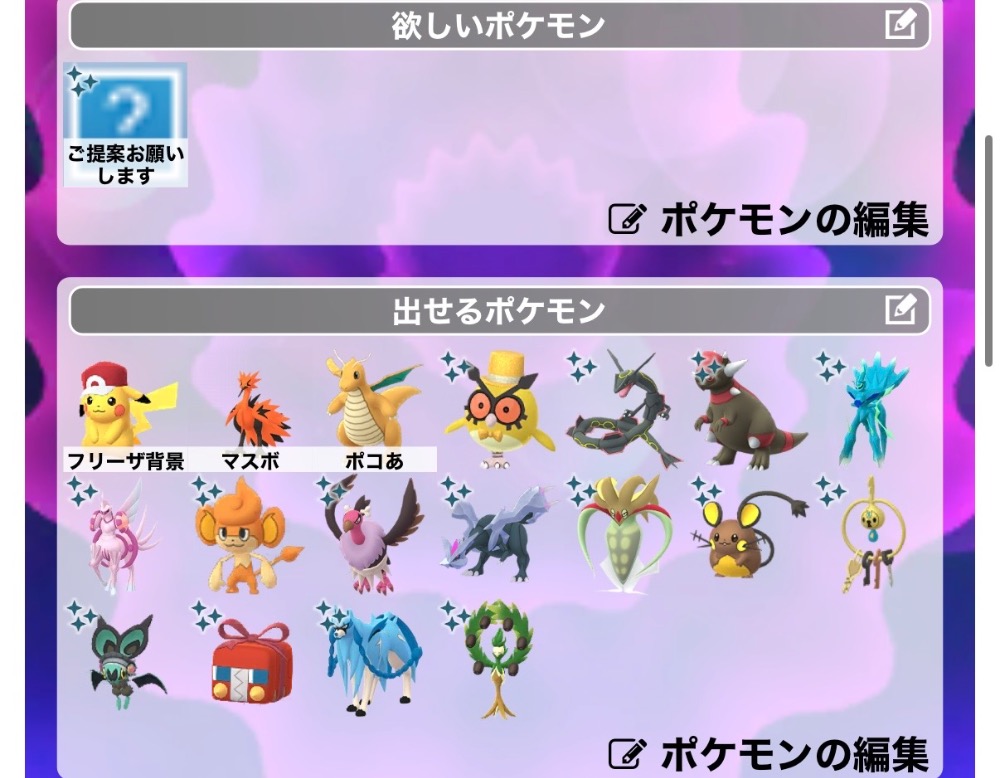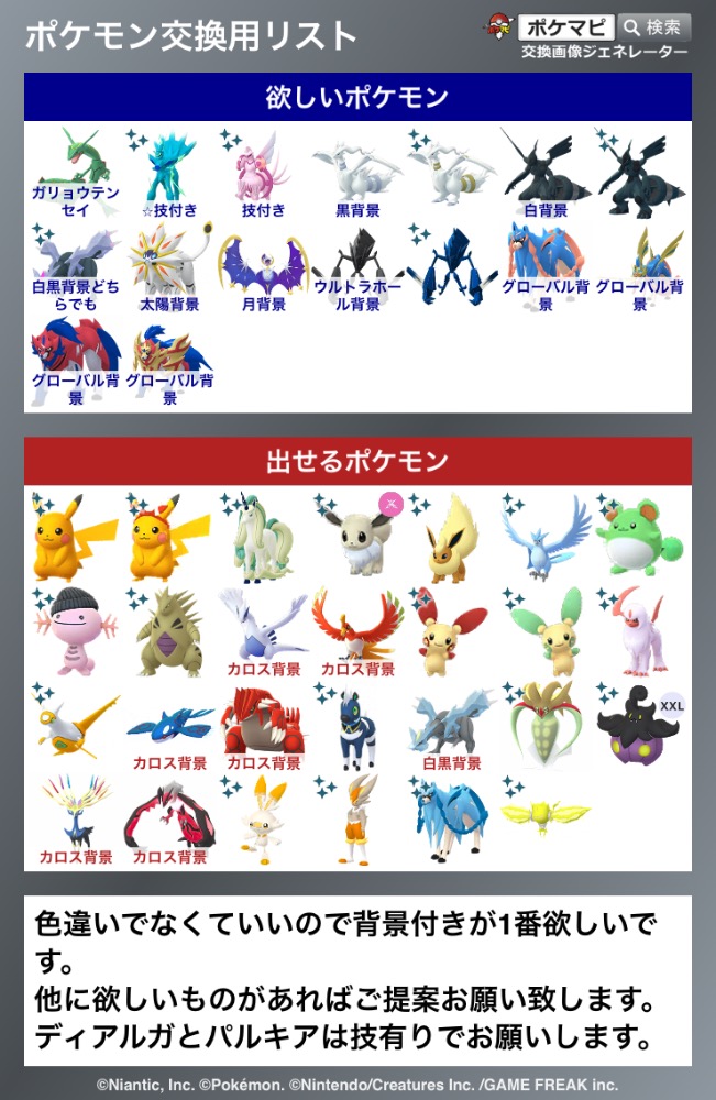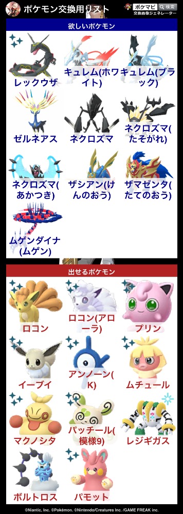 | 出せるポケモン | 色違い背景ザシアン or 色違い背景ザマゼンタ 星の砂9万しかないのでできれば所持済みの人とリモート交換したいです |