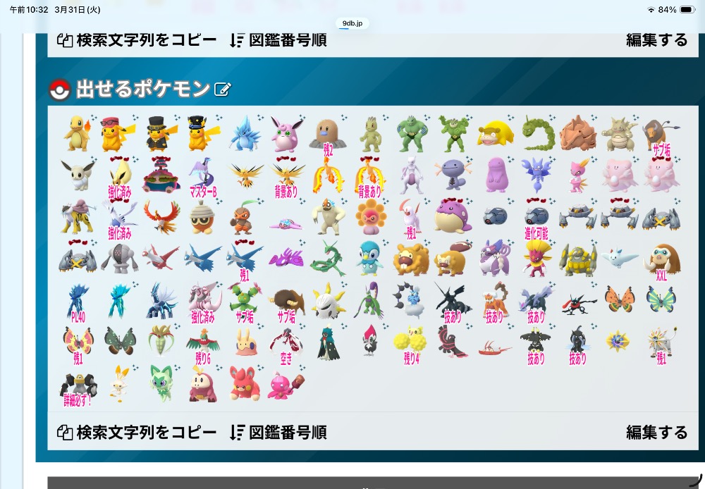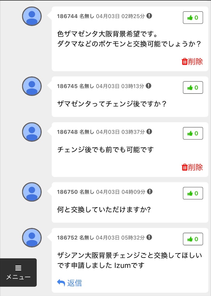 | コメント | レイドの合間に同種で01交換してくださる方を募集中です。 各50体くらいは出せます! よろしくお願いいたします。 Twitterかキャンプファイヤーでやりとりお願いいたします。 @taka7hasu7 |