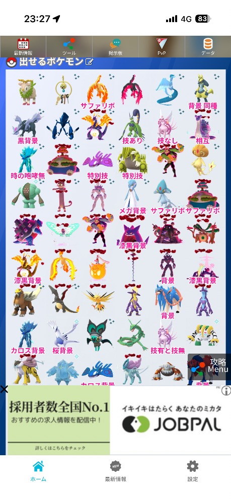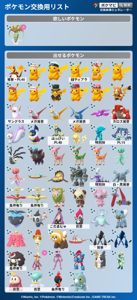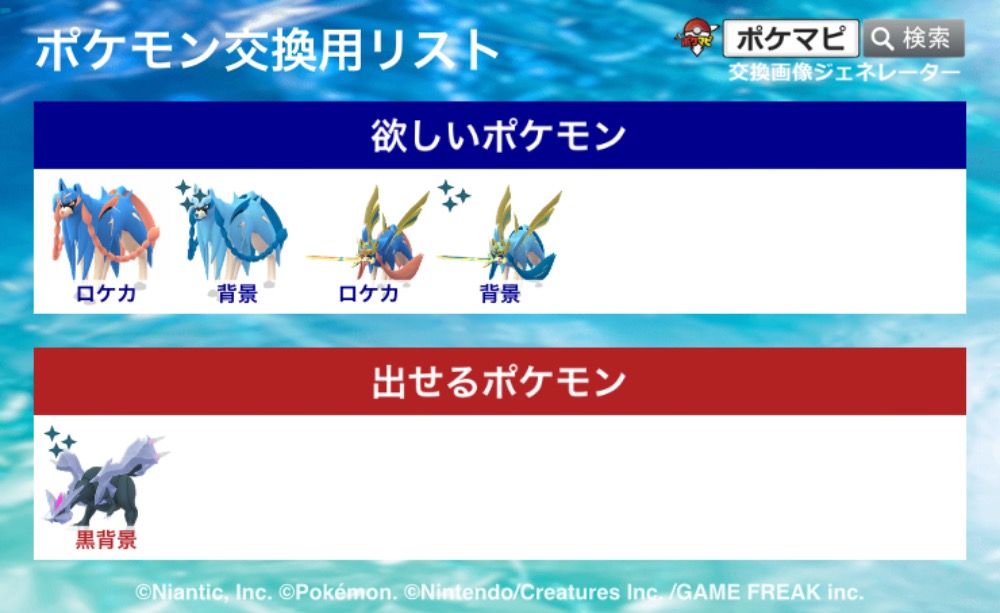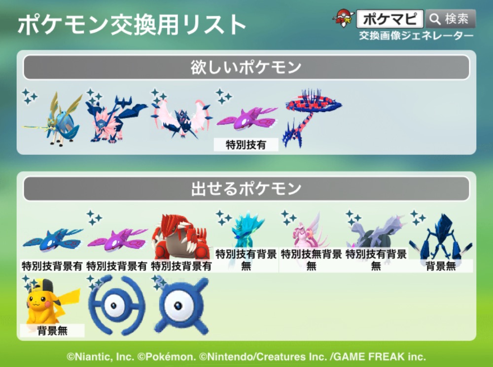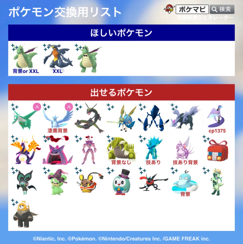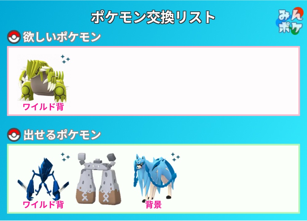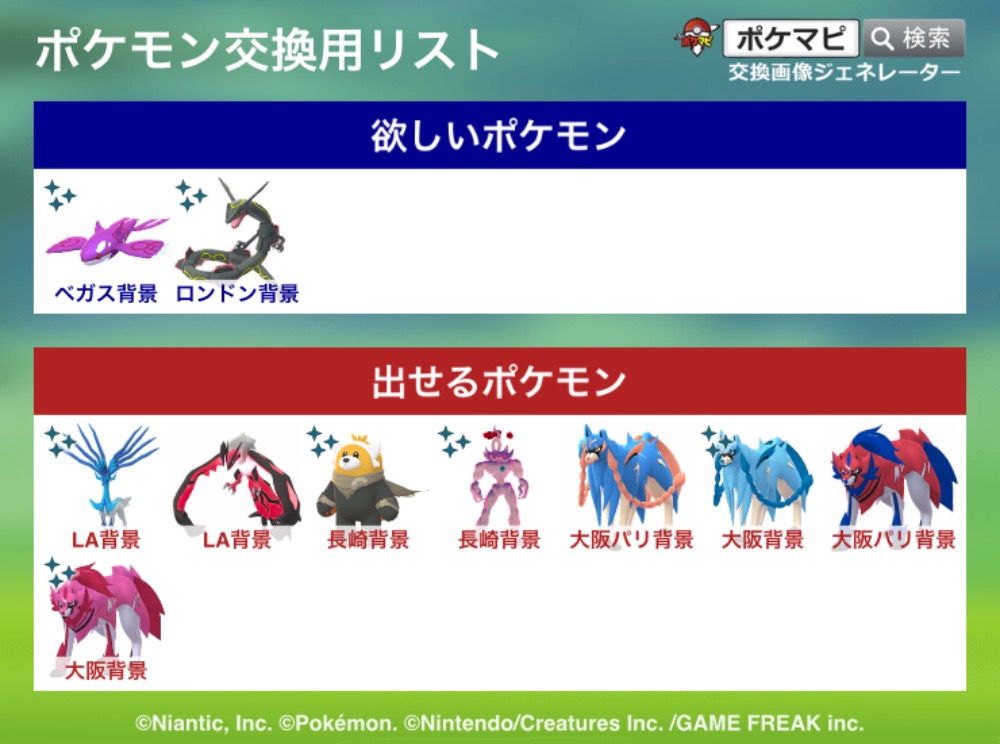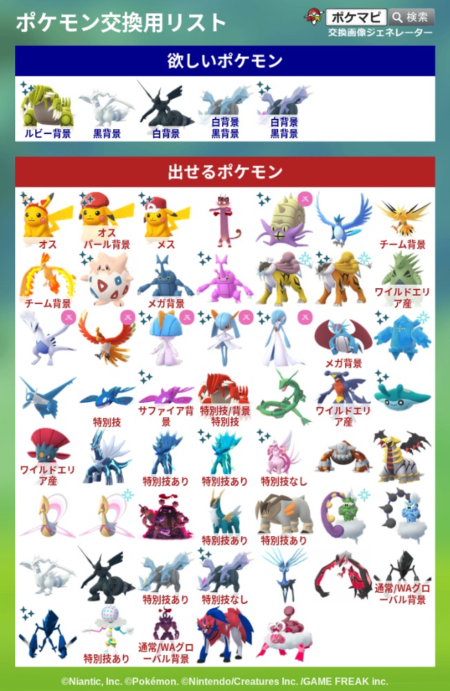 | 出せるポケモン | 【出】 色ウツボット(メガ背景) 色コレクレー(周年背景) 色巨大マックスゲンガー(紫背景) 色キュレム(黒背景or白背景) 色ネクロズマ(グローバル背景) 色ゼルネアス(背景) 色ザシアン(グローバル背景or大阪背景) 色ザマゼンタ(大阪背景) 色カイオーガ(サファイア背景) 色ファイヤー(チーム背景) 色違い背景のみを挙げました。他にも聞いてくれたらあると思います! |