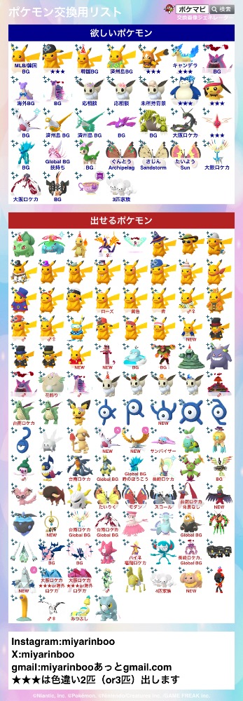 | 出せるポケモン | 色ドロバンコ、色シンボラー、色オドリドリメラメラ(サファリ産)、通常色サファリ帽イーブイ等もお出しできます。 通常色でしたらリアルイベントのロサンゼルスロケカポケモン等もお出しできます。 |