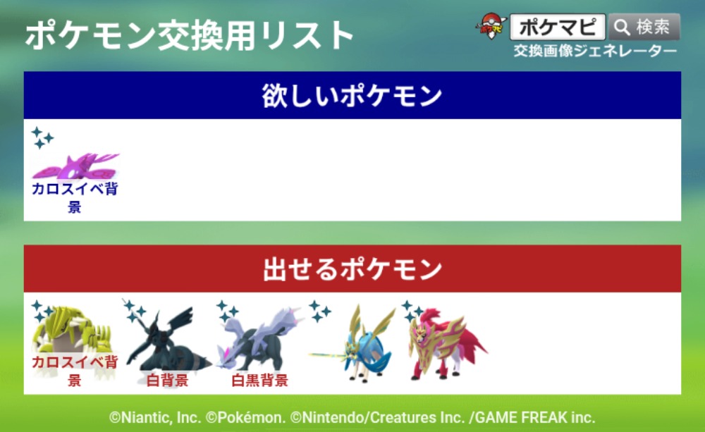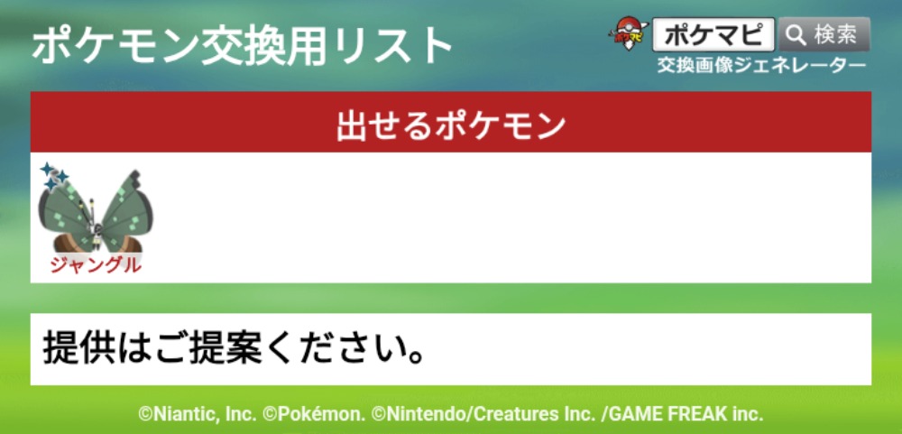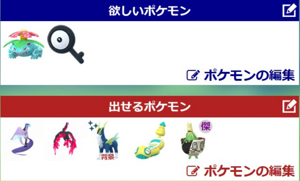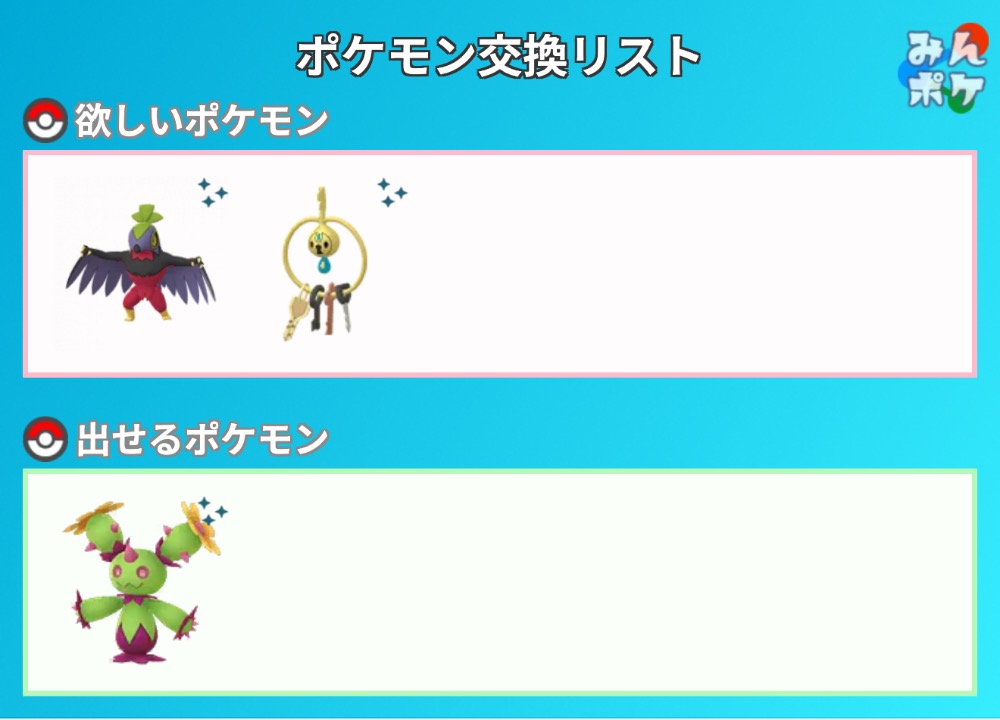 | コメント | ①カロスツアーで入手できなかったポケモンを中心に探しております。 ②お早めに交換できる方を探しております。 キラ交換はポケモンのプロフィール背景が好きではないため、あまり望んでおりません🙇♂️ |