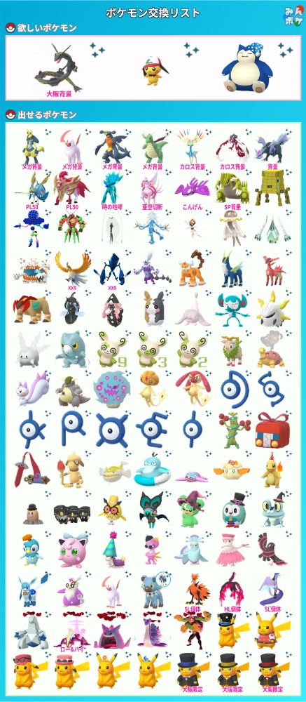 | 出せるポケモン | トロピウス クイタラン ーーーーーーーーーー 色違い ポワルン デリバード(クリスマスver) イシズマイ ポリゴン2 ウパー エレキッド ニドラン♂♀ ハスボー ルギア ガラガラ(アローラ) イシツブテ(アローラ ) ニョロモ グランブル ヤジロン ホウオウ ルギア ニューラ ナゾノクサ オタチ イワーク |