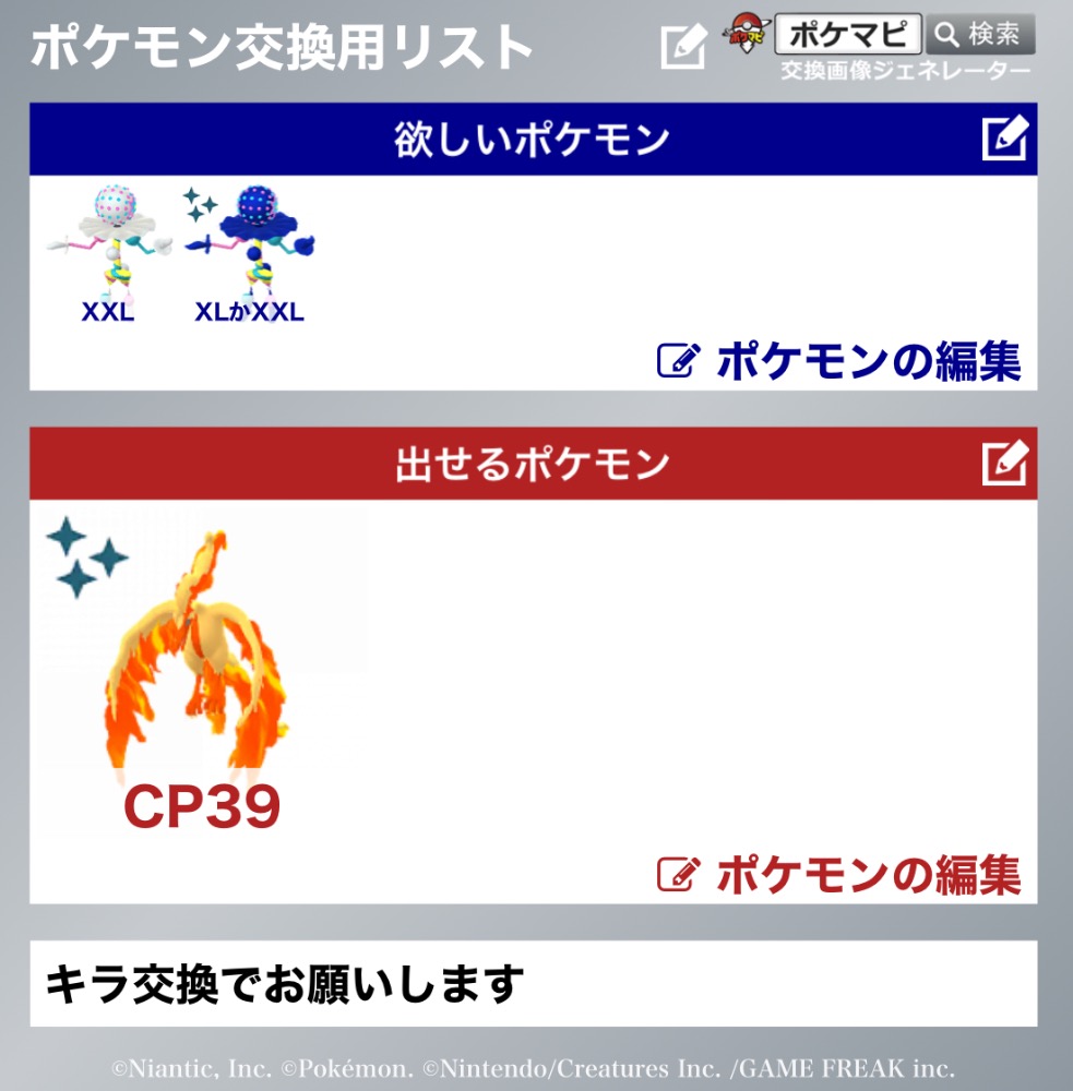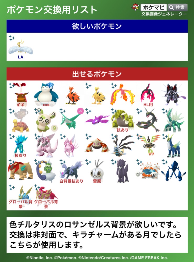 | コメント | キラ交換でお願いします! 色コレクレーはサーフゴーに進化できる個体という意味で、メダル自体は用意しなくても大丈夫です ロケカや古い色コスはないですが、他に提案ありましたら探してみます |