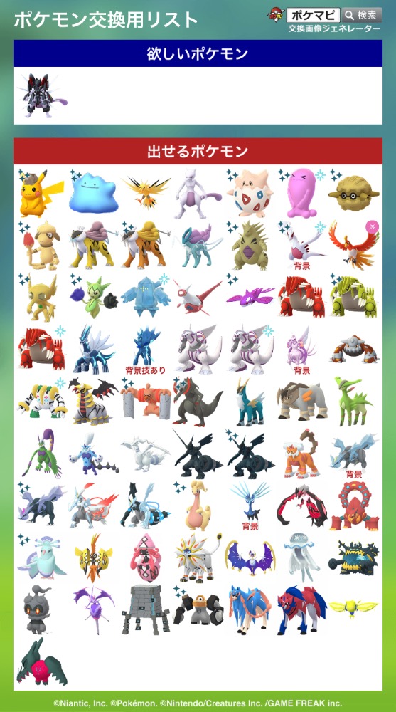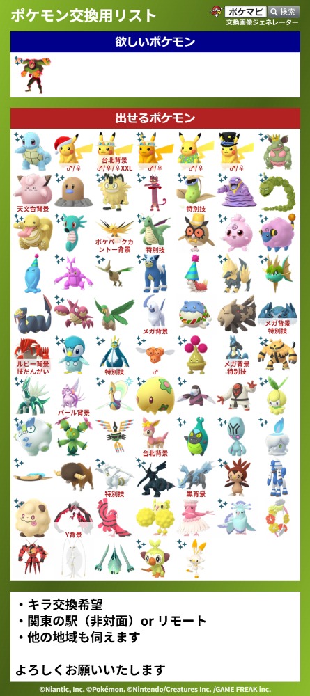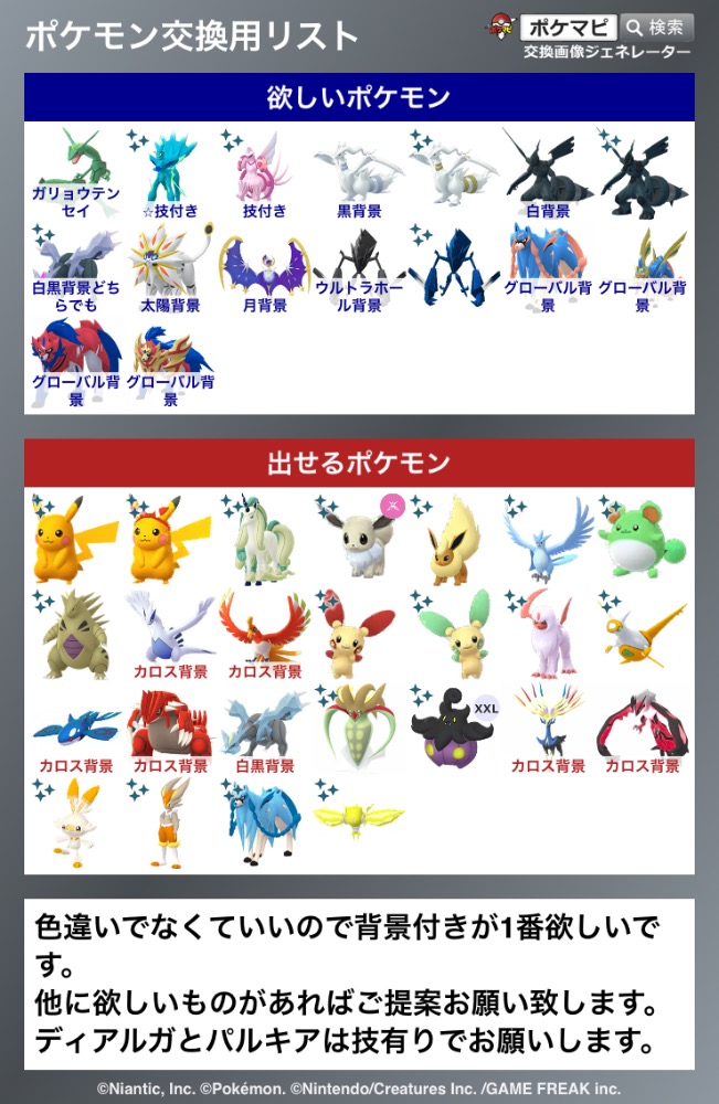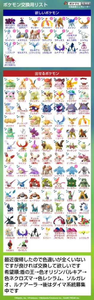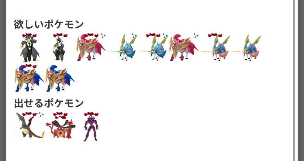 | 出せるポケモン | 色違い背景ザシアン or 色違い背景ザマゼンタ 星の砂9万しかないのでできれば所持済みの人とリモート交換したいです |