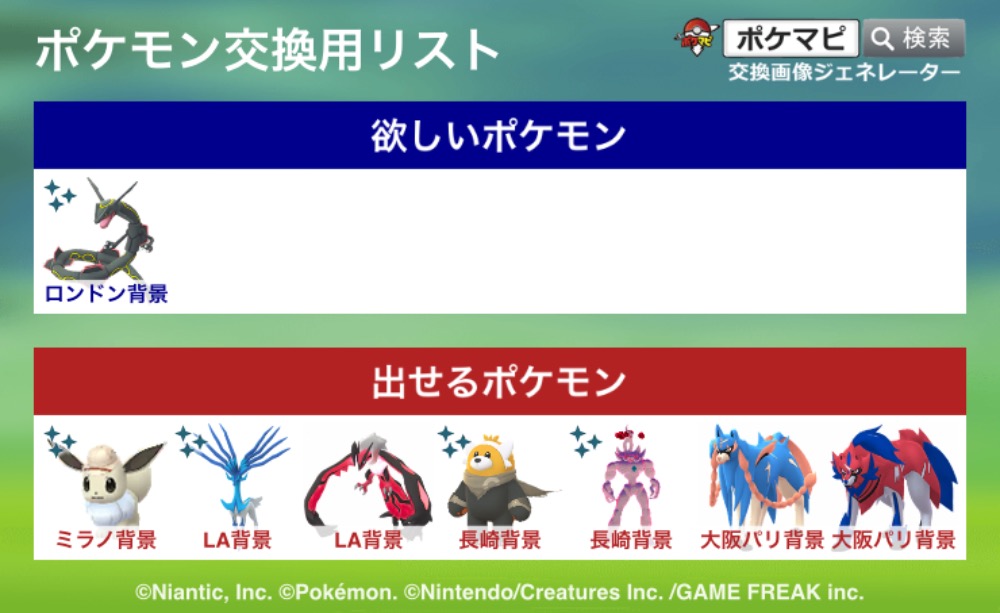 シカゴ、コペンハーゲンのゴーフェス参加予定なので背景色違いミュウツーとロンドン背景色違いレックウザとの交換希望です。こちらでキラチャーム負担します。ご検討よろしくお願いします。