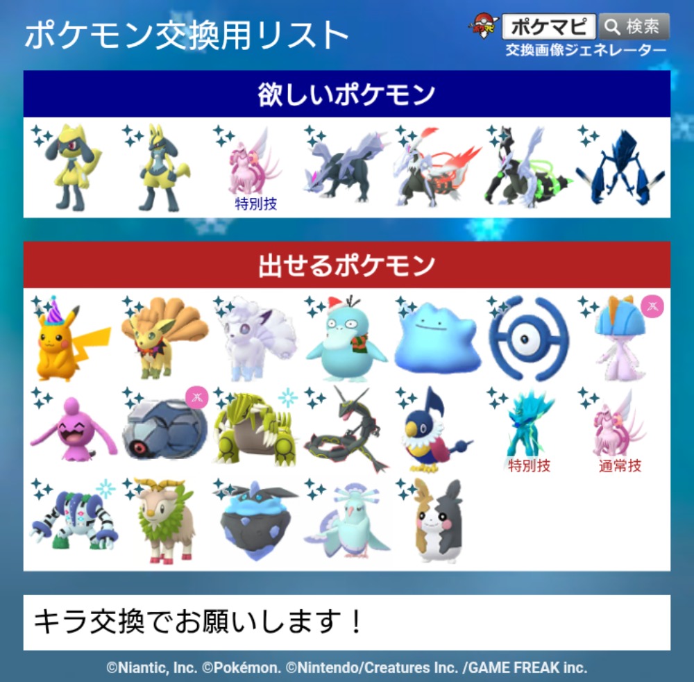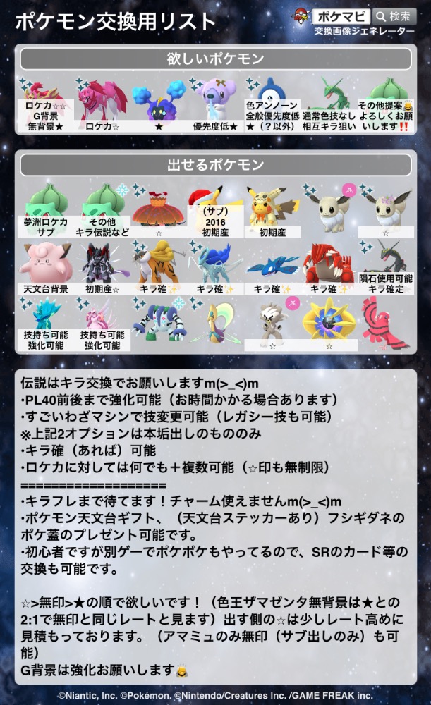 | コメント | フレンドレベル(最低親友以上) 図鑑登録なし キラ交換優先 要相談 |