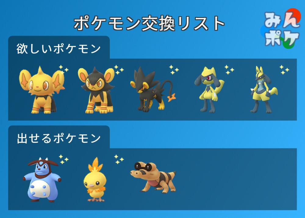 | 欲しいポケモン | ポケモン(求):ドッコラー、ヒンバス、モノズ、フカマル、リオル、ガラルマッギョ、ギラティナ、ディアルガ、その他の伝説でも可 |