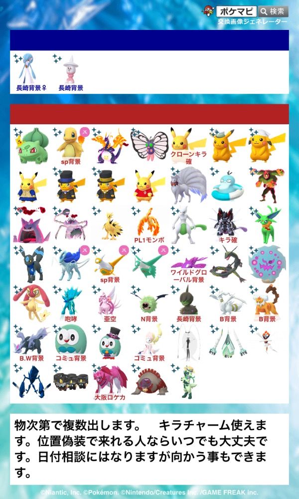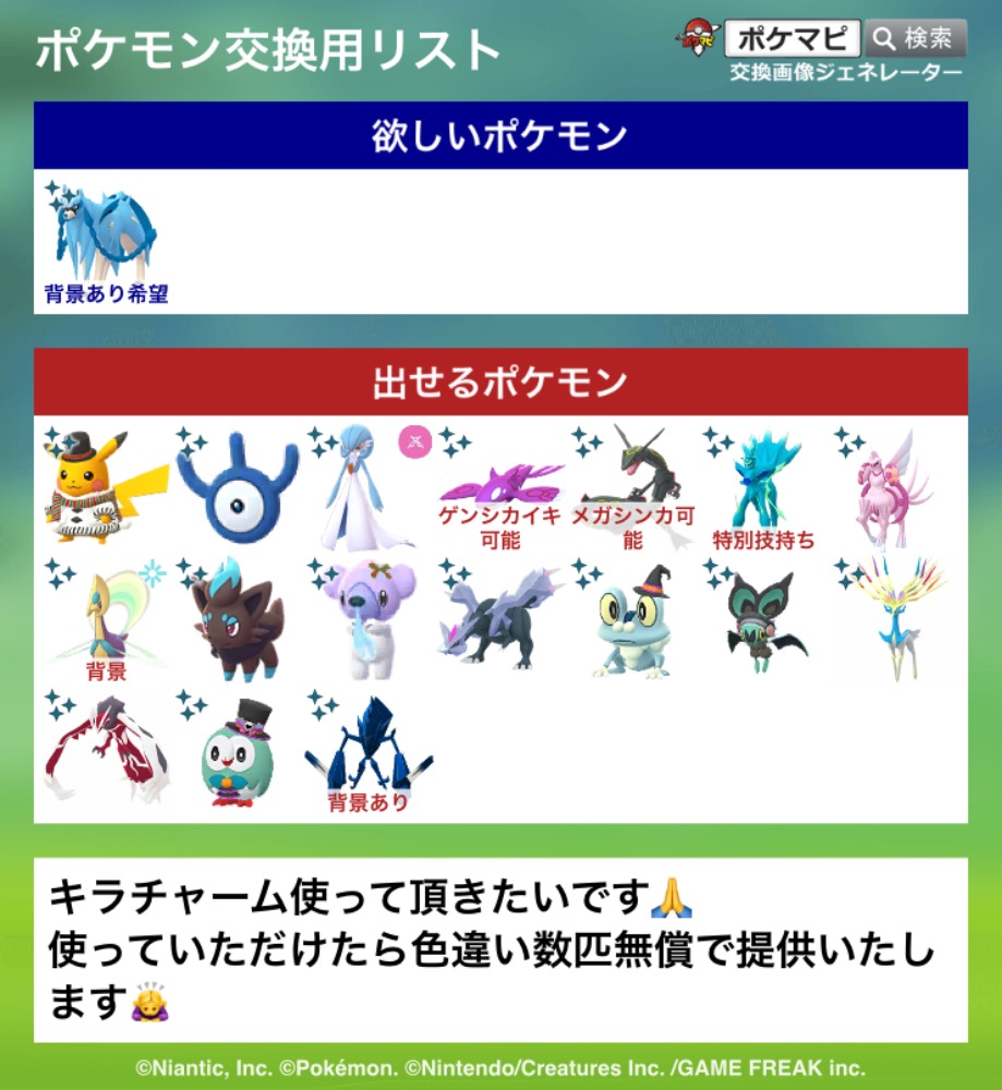 | コメント | 欲しいポケモン、出せるポケモン、連絡先を記載してください。よろしくお願いします。 |