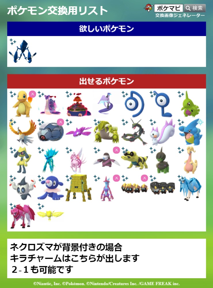 | 出せるポケモン | 相談したいです。 色違いバンギラス、フカマル、コバルオン等です。 |