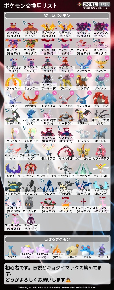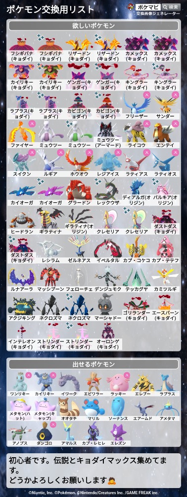 | コメント | 旅行で東京に行きます。(3/18と3/20に東京駅通過) 図鑑未登録ですが、フレンド後すぐ交換できればと考えております。 |