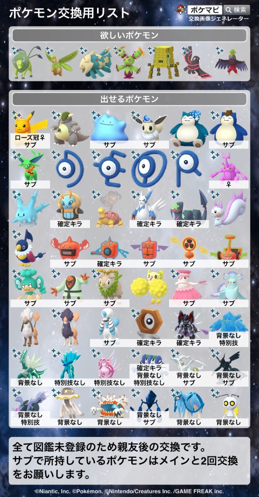 | コメント | トレーナーコード0063 6660 8091 何回か適当にトレードして親愛度上げてからトレードしましょ |