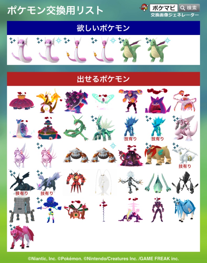 | コメント | ○装できます。キャンプファイアで連絡取り合えます。 第一希望は図鑑登録している色ミニリュウです。 人気がありそうな分を並べてみましたがこちらが出せて、希望に応えられるポケモンは他にもいるかもしれませんのでお問い合わせ下さい。 |