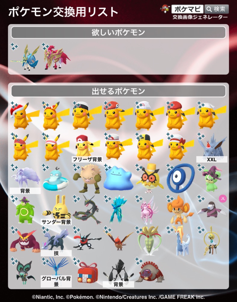 | コメント | ポケモン(求):画像の通り ポケモン(出):画像の通り 交換場所 :大親友+のリモート交換にて クルタ、サリーのピカチュウに関しては背景もございます。 追記 黒レックウザはアーマードミュウツーとの交換を行う際にしか提示しません。 ※ \"XXLサイズ\" の黒レックウザとなります。 連絡手段につきましては X(@jw_amu)かInstagram等でよろしくお願いします |