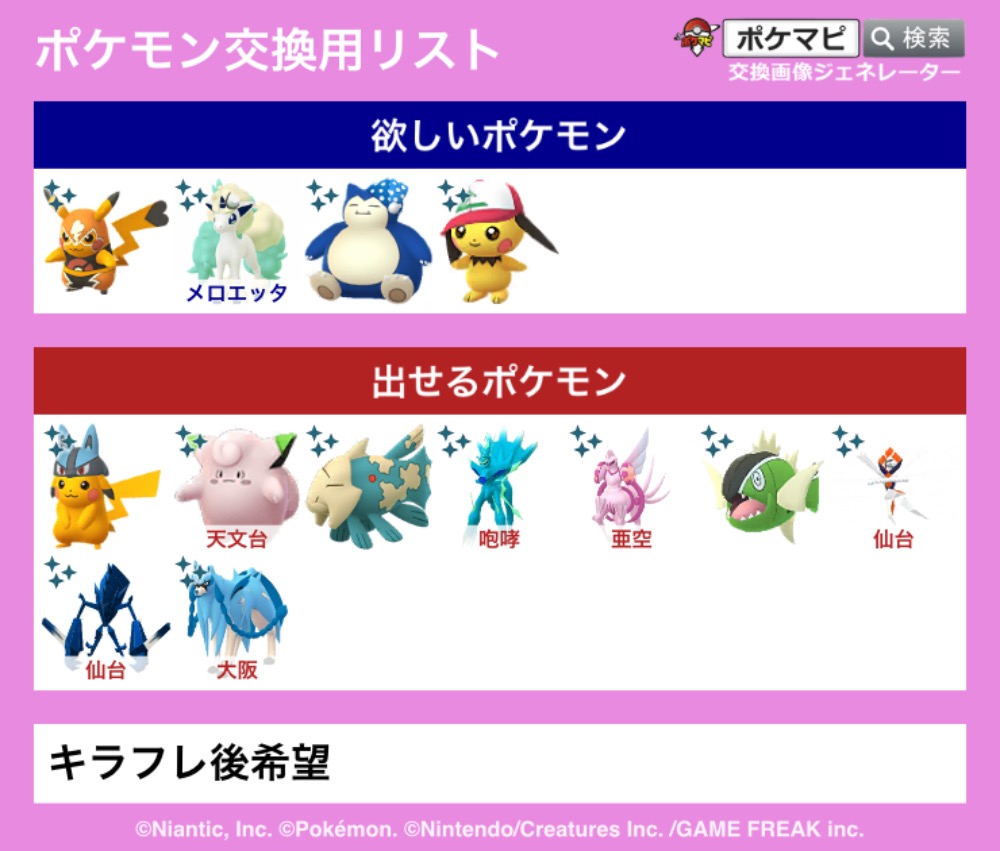 ご希望のポケモンはあらかた出せそうです。こちらの希望は色違いピカチュウルカリオハットです。