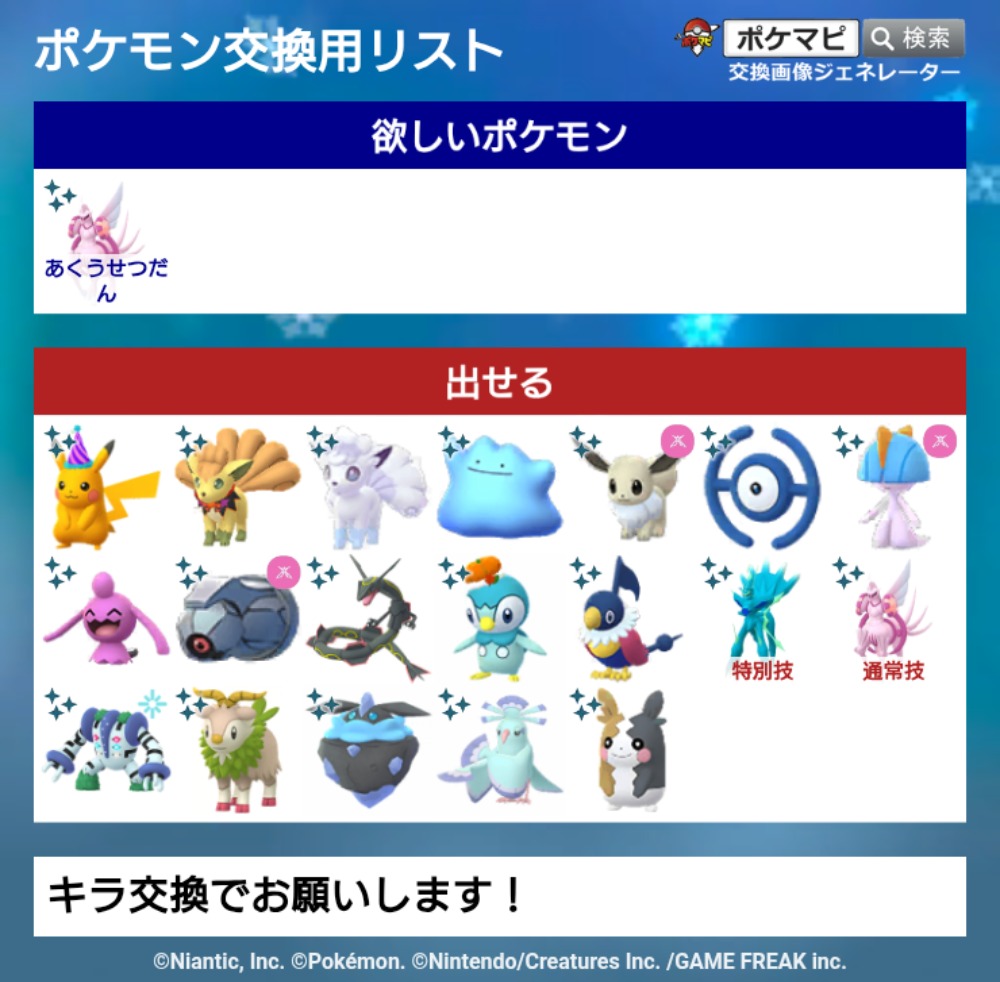 | 出せるポケモン | 要相談 出せるのはたくさんあるので、やりとりで決めたいです! |
