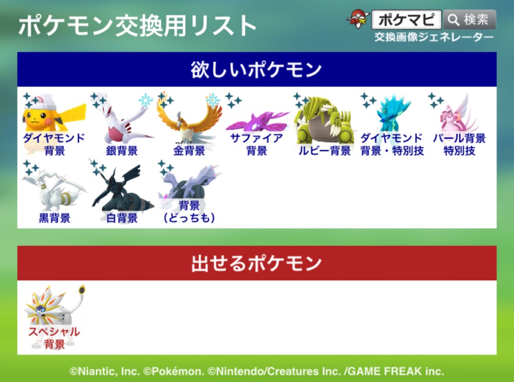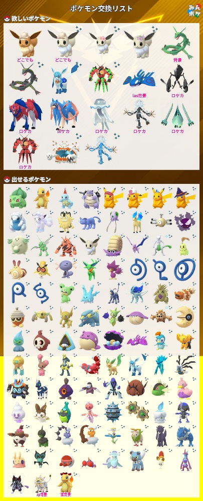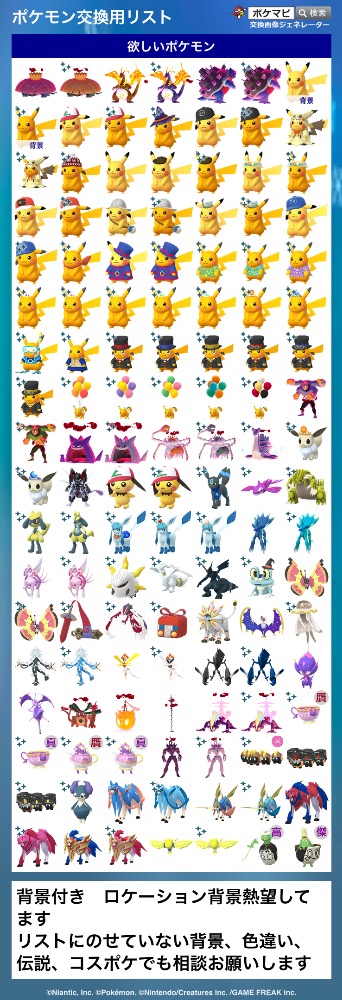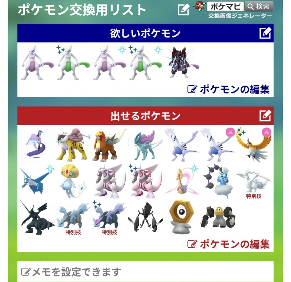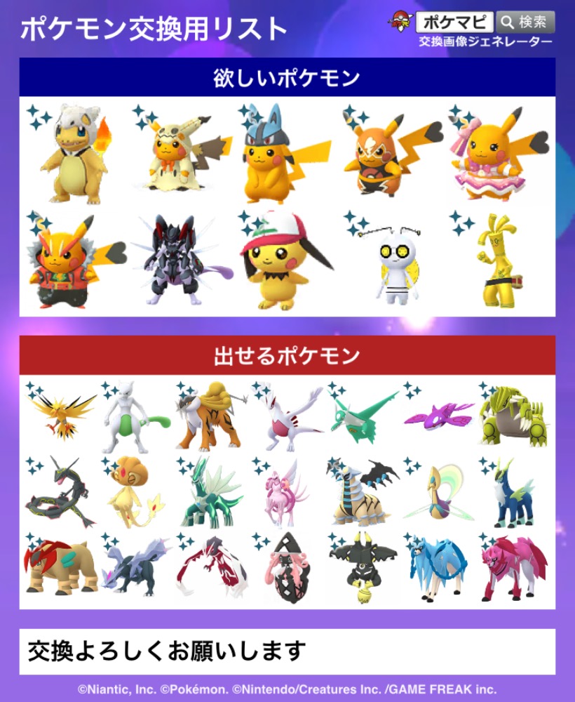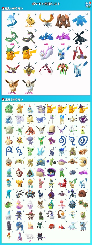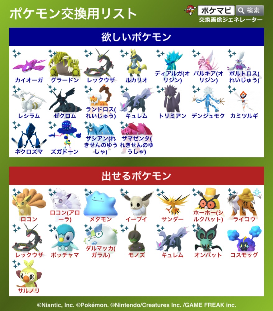 | コメント | ポケモン(求):画像参照 ポケモン(出):画像参照 交換希望場所:岐阜、愛知 交換希望日:相談 詳細なやり取り(TwitterIDなど): 非対面希望です! サファリイーブイはどこの背景でも大丈夫です |