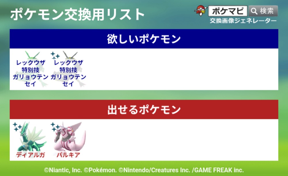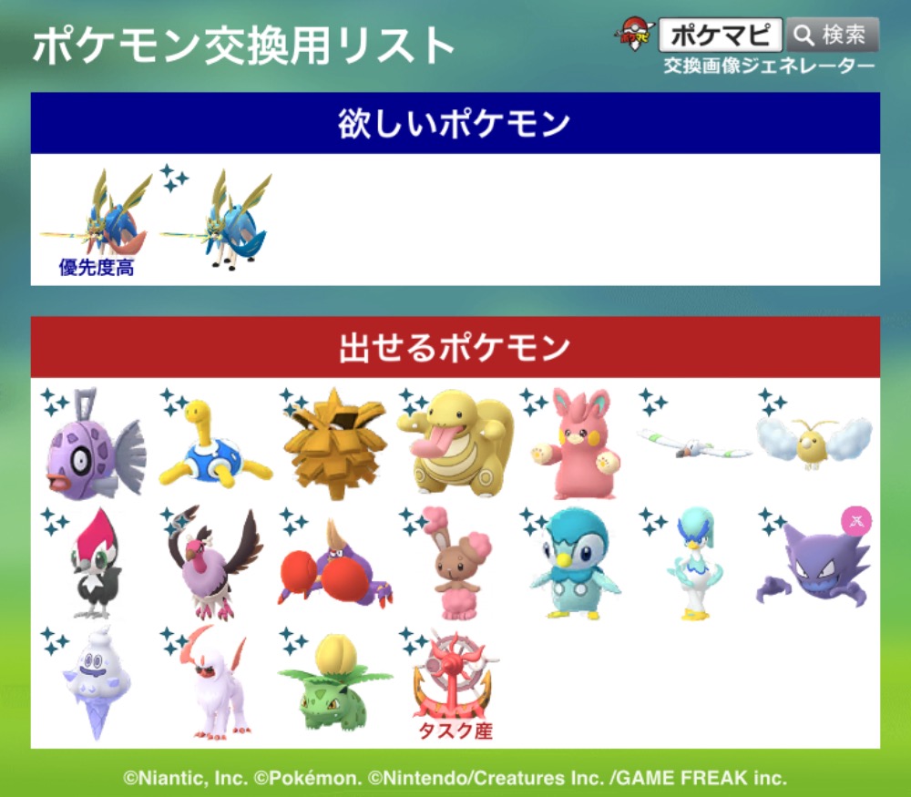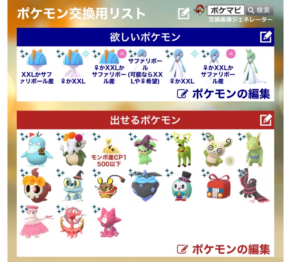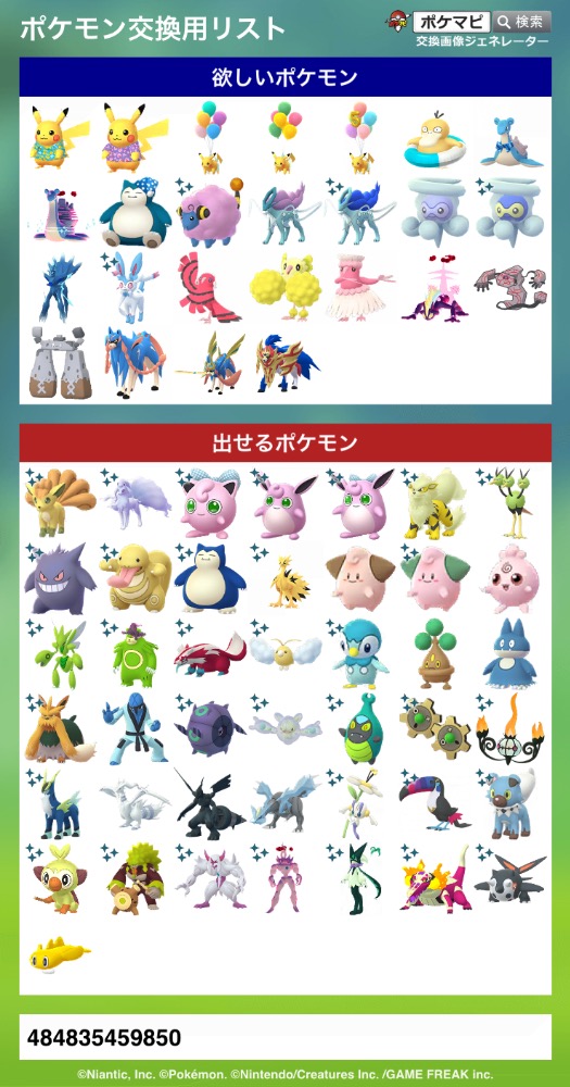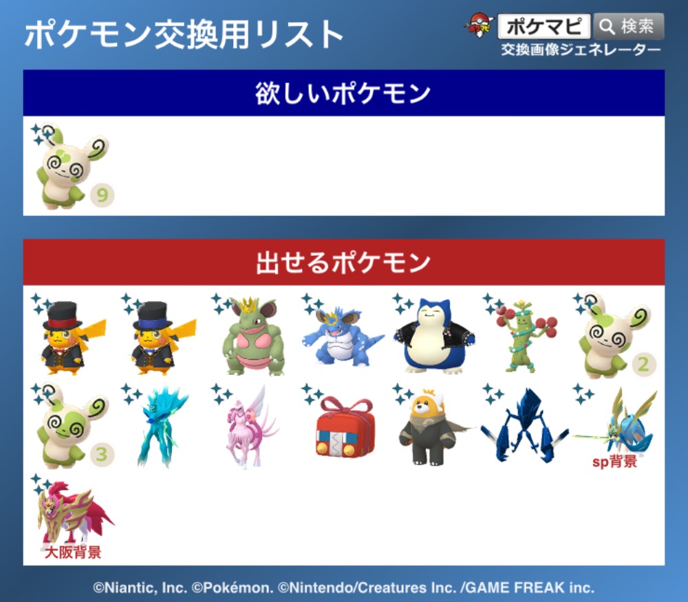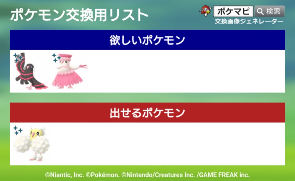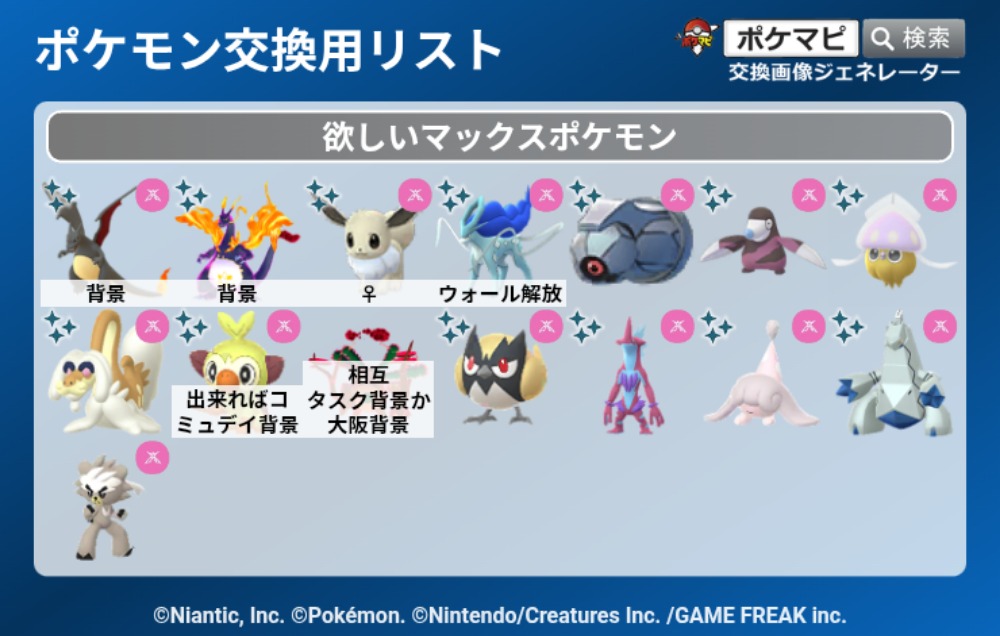 | コメント | ポケモン(求):画像参照 ポケモン(出):画像参照 交換希望場所:岐阜、愛知 交換希望日:相談 詳細なやり取り(TwitterIDなど): 非対面希望です! サファリイーブイはどこの背景でも大丈夫です |