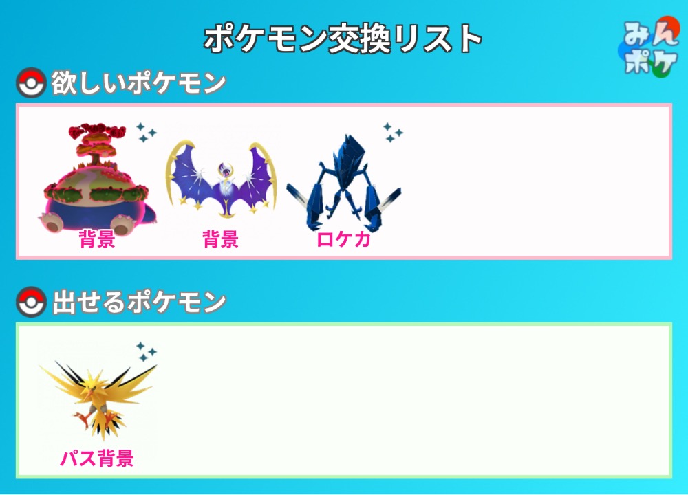| コメント | 最優先は白背景ゼクロム、色違いザシアン ザマゼンタ 非対面 フレンドレベル親友以上 キラ交換希望(キラフレンドになってから交換希望or2020年以前のポケモンでの交換) 図鑑未登録OK 特別な交換(伝説、色違い)希望 画像とあわせて確認してください 1匹対2匹~3匹などの交換OK 連絡手段は基本X |
