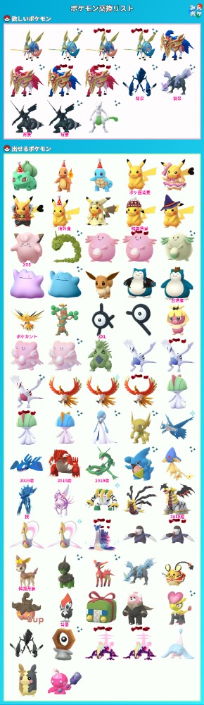 | コメント | ①プラスルやマイナンはバレンタインイベントの個体ですと嬉しいです。 ②交換が成立するまでこちらの掲示板や、SNSでやり取りできる方ですと幸いです。 宜しくお願いします。 |