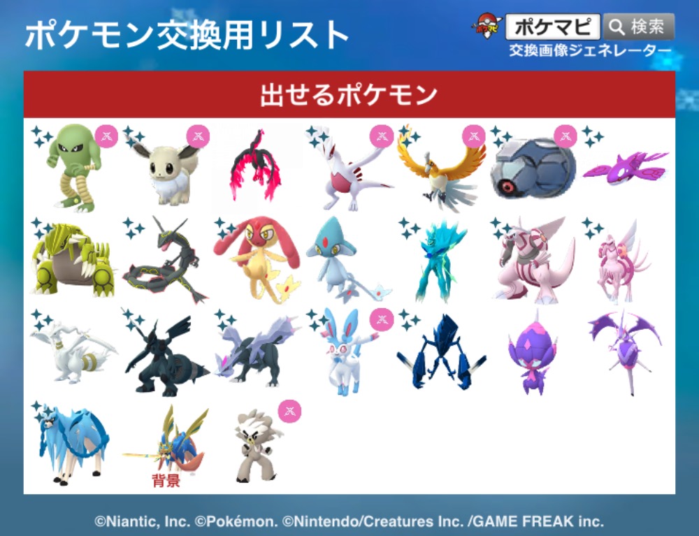 通常色アナハイムロケカピカor通常色桜ロケカピカor通常色新北ロケカキュレムor通常色大阪ロケカザシアンorザマゼンタ(フォルムチェンジはできません)or通常色長崎ロケカキョダイマックスオーロンゲ出せます。
