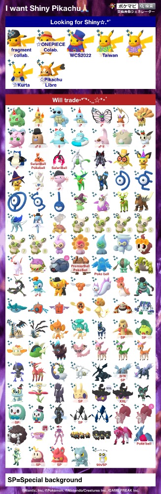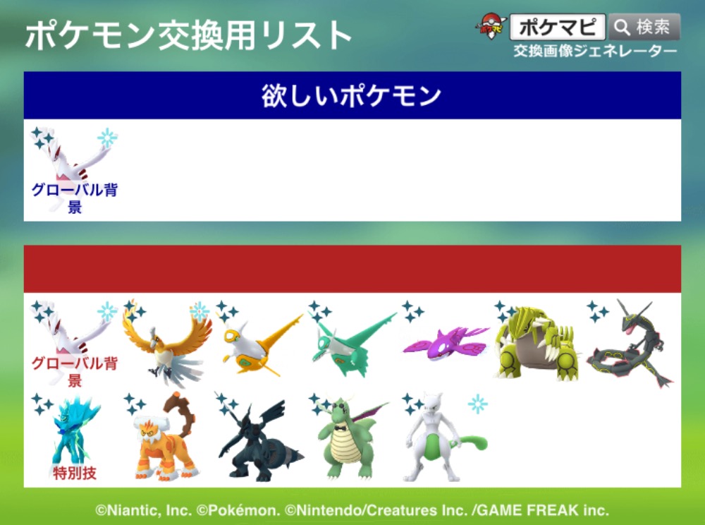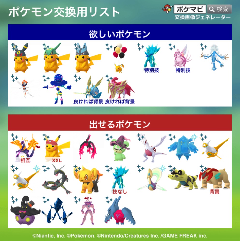 | 欲しいポケモン | ピカチュウ→MLB2025コラボイベント ラティアス/ラティオス→背景/バリ島 チェジュ島 ジャカルタ ス レックウザ→技,ガリョウテンセイのみ クレセリア→背景/長崎 カミツルギ→背景/仙台 ネクロズマ(色違い)→背景/仙台 newyork madrid その他は条件なし画像参照 |