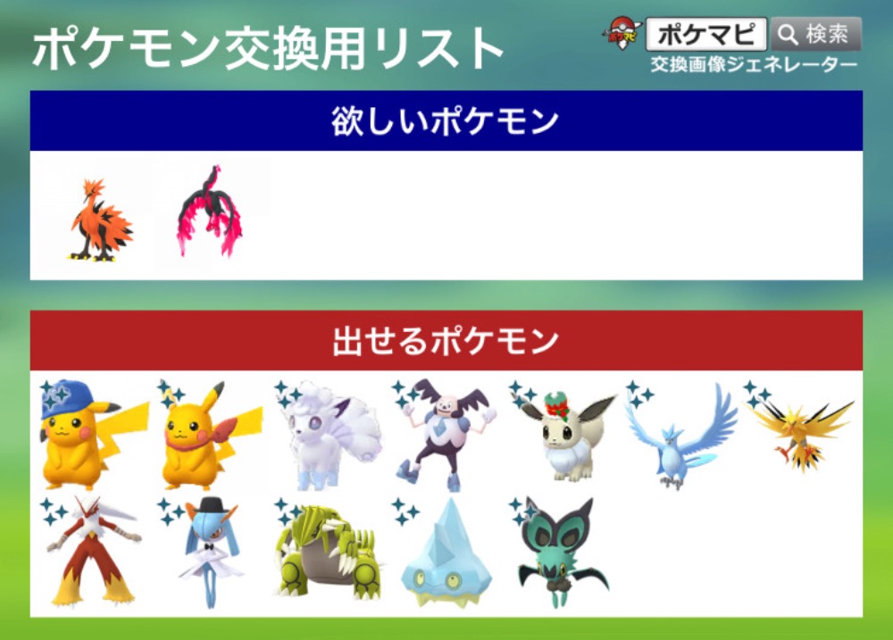| コメント | カントーを集めているので、ガルーラと三鳥をお願いします。 三鳥はなるべくキラ交換をお願いします🙏 非対面希望です |