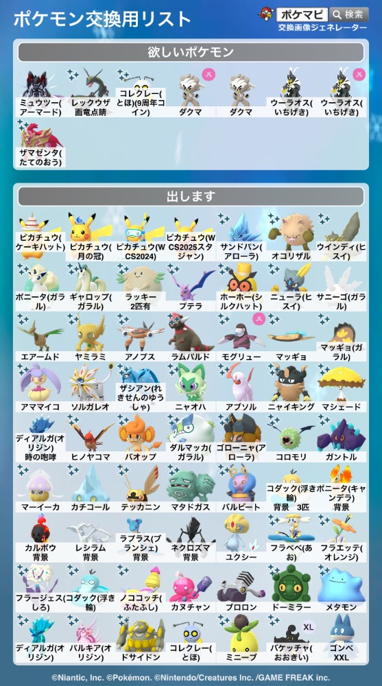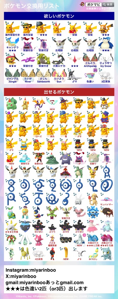 | コメント | 交換掲示板を更新! InstagramまたはXまたはGmailでご連絡ください🙇🏻 ・対面/非対面OK ・都内近郊または長崎ワイルドエリアでの交換希望。レアポケモンは引き取りに伺います! ・★★★は2匹(or3匹)お出しできます※ポケモン次第 ・韓国やMLBなど各種海外背景イロチも熱望! ・インドネシア🇮🇩焦げピカ、背景付き🛟コダック、ウミディグダ、大阪ロケカ2種類、ダイマックスジュラルドンなどを追加しました! ・エレズン、カルボウ、バッフロン、マラカッチ、シンボラー、Gサニーゴ、キョダイマックスは早い者勝ち! ・コフキムシは進化後でも可 Instagram、X:miyarinboo Gmail:miyarinboo@ #ポケモン交換 |