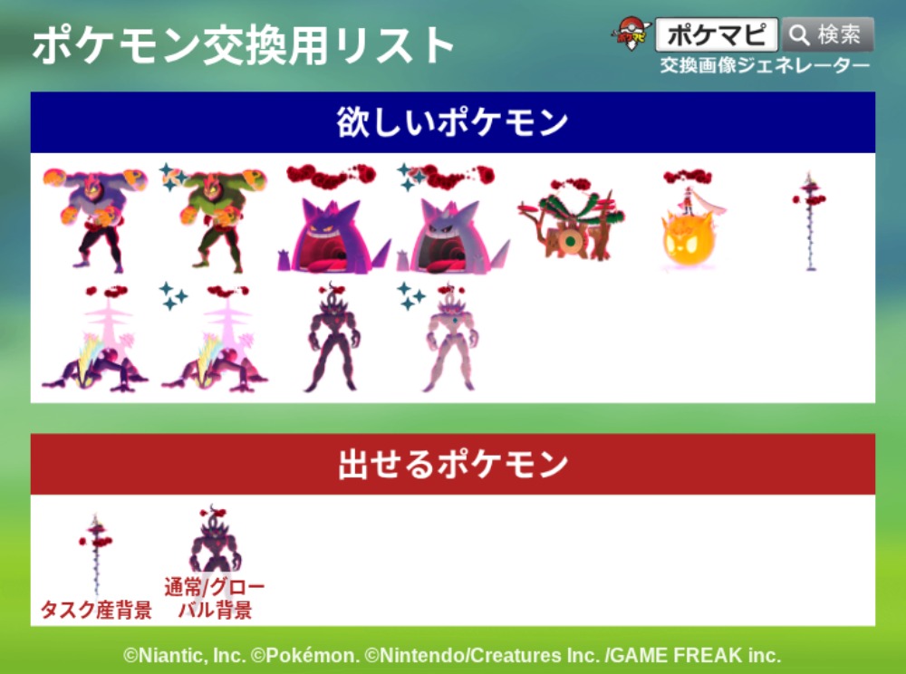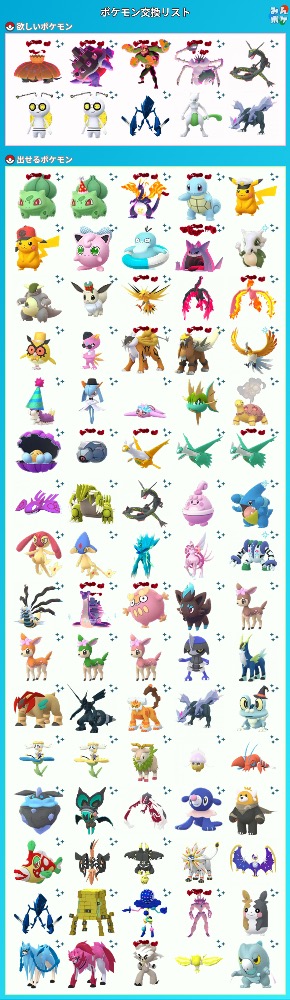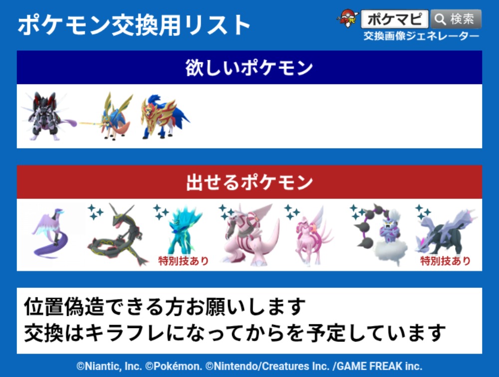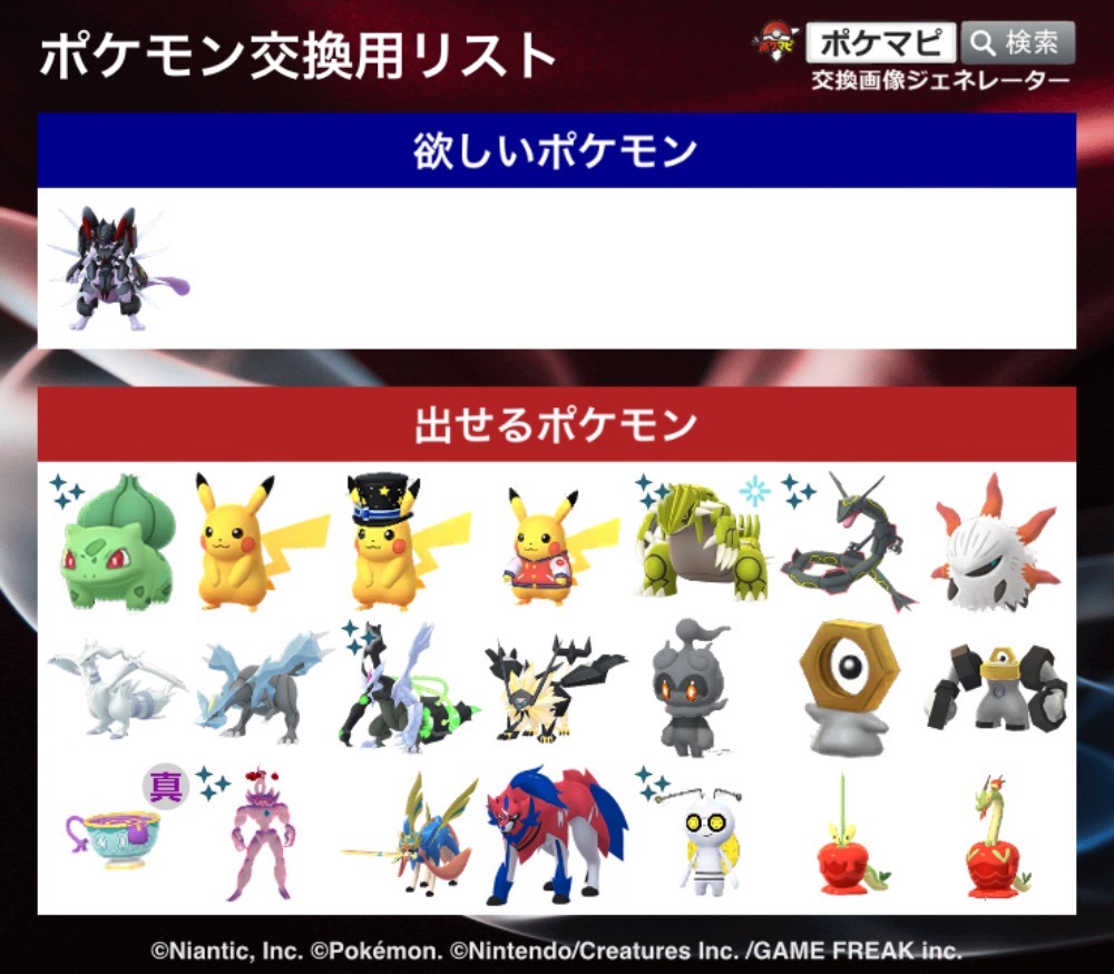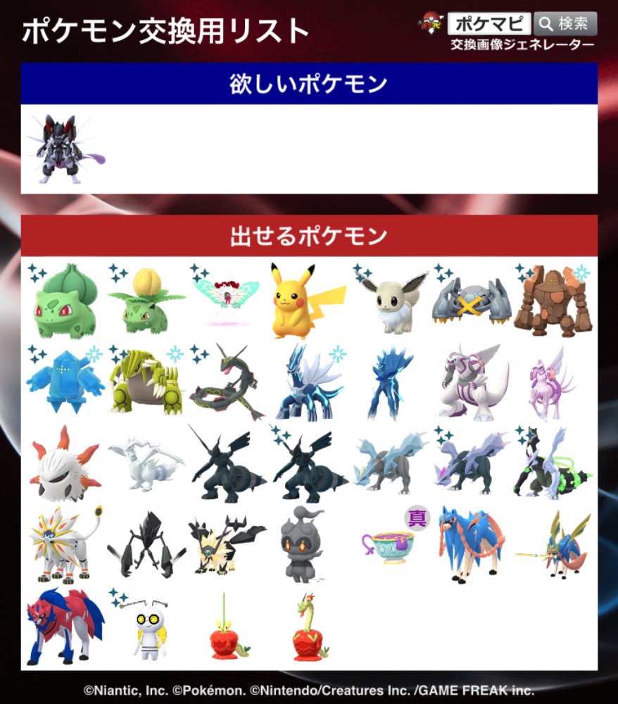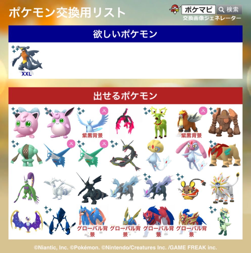 | 出せるポケモン | 色背景ネクロズマ 色クレセリア(2019産) アーマードミュウツー(2019産) 色ゼルネアス ザマゼンタ(XXL) 色ザシアン(けんのおう、CP5505)←これは複数との交換のみです その他諸々の伝説、色伝説 |