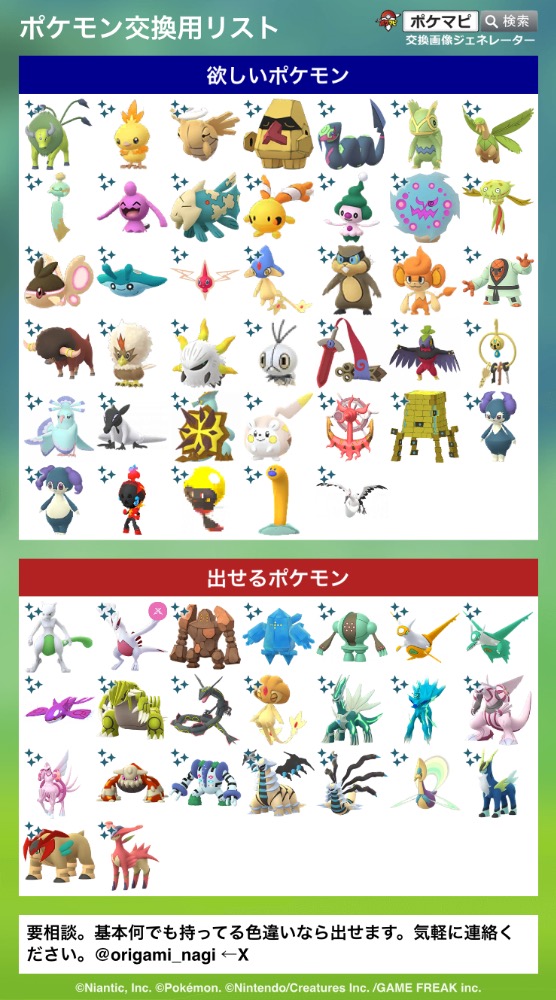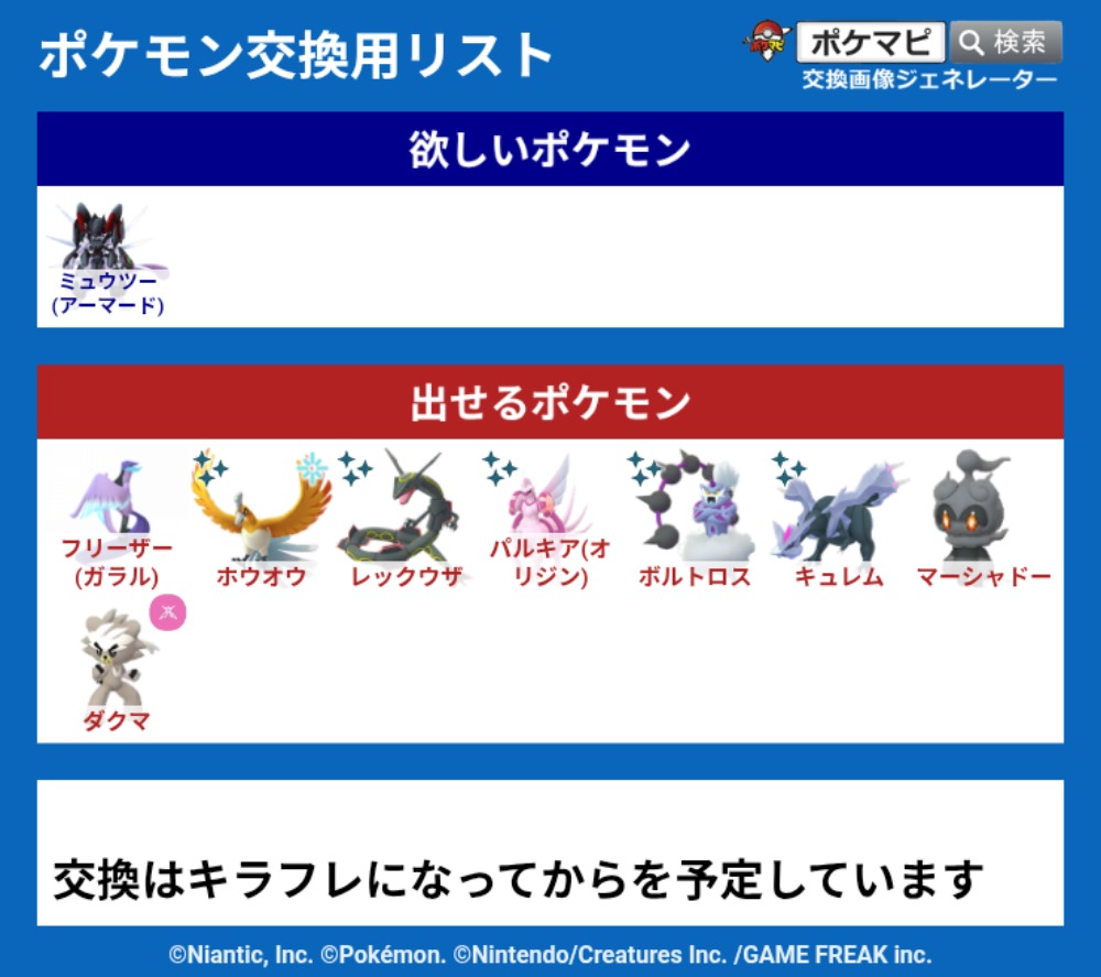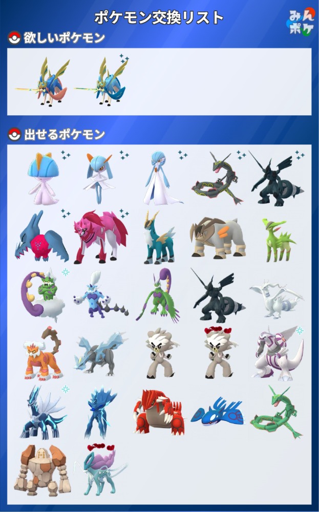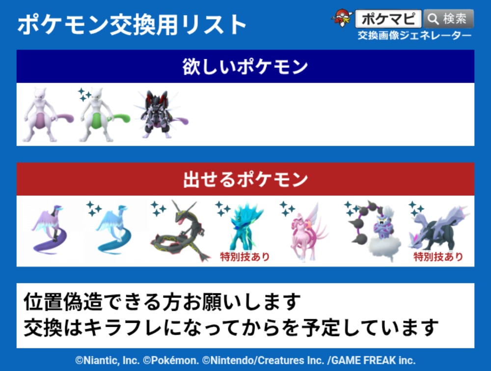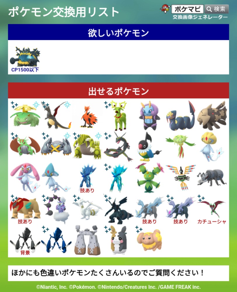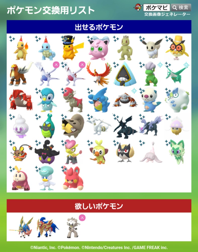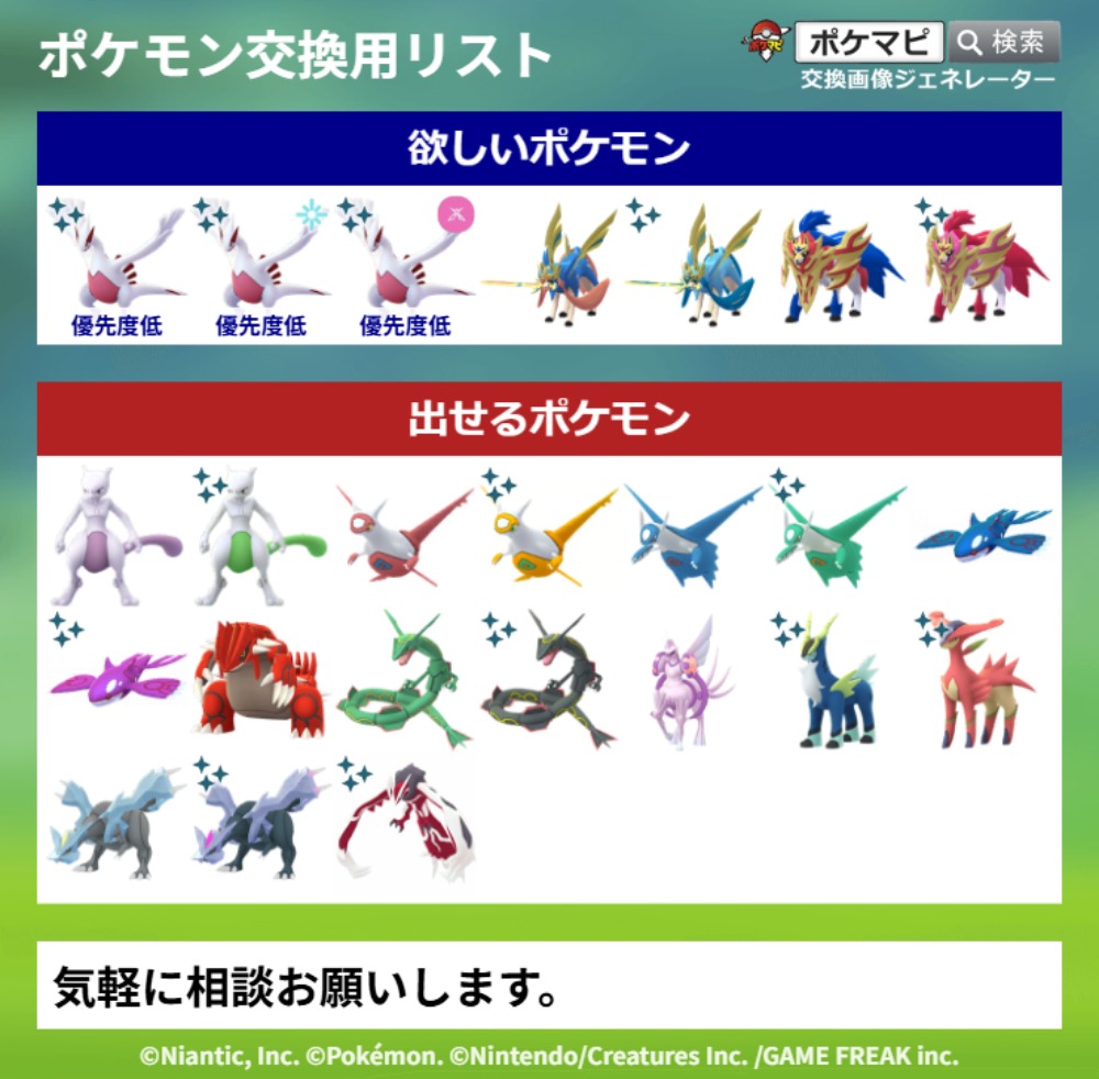| 出せるポケモン | 色背景ネクロズマ 色クレセリア(2019産) アーマードミュウツー(2019産) 色ゼルネアス ザマゼンタ(XXL) 色ザシアン(けんのおう、CP5505)←これは複数との交換のみです その他諸々の伝説、色伝説 |