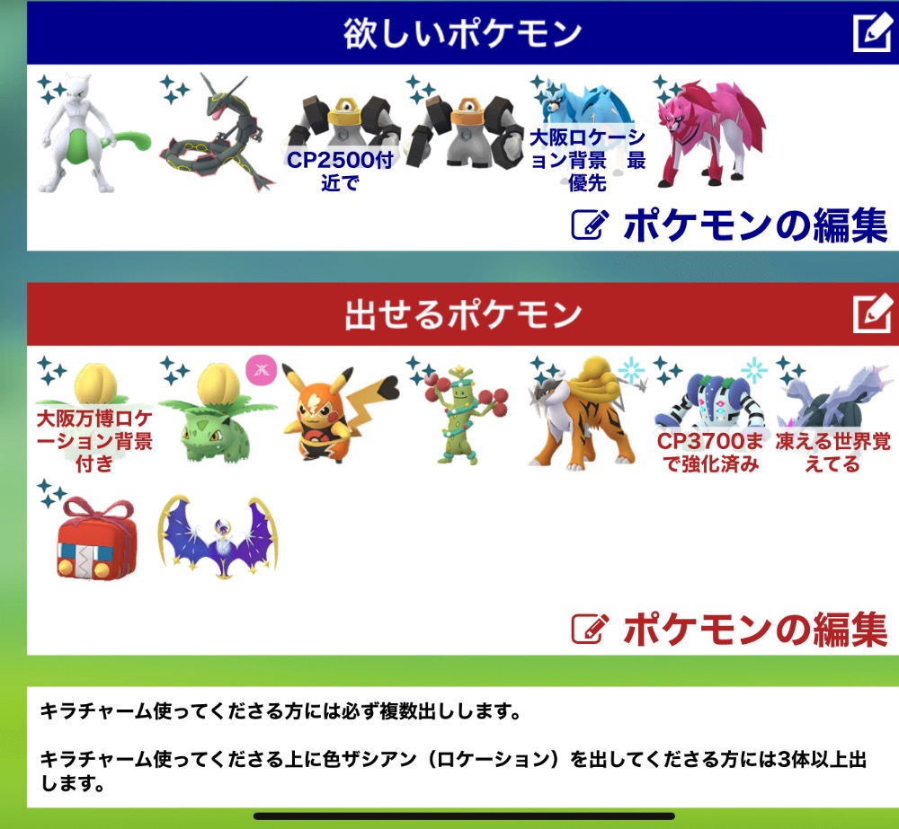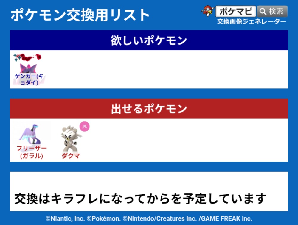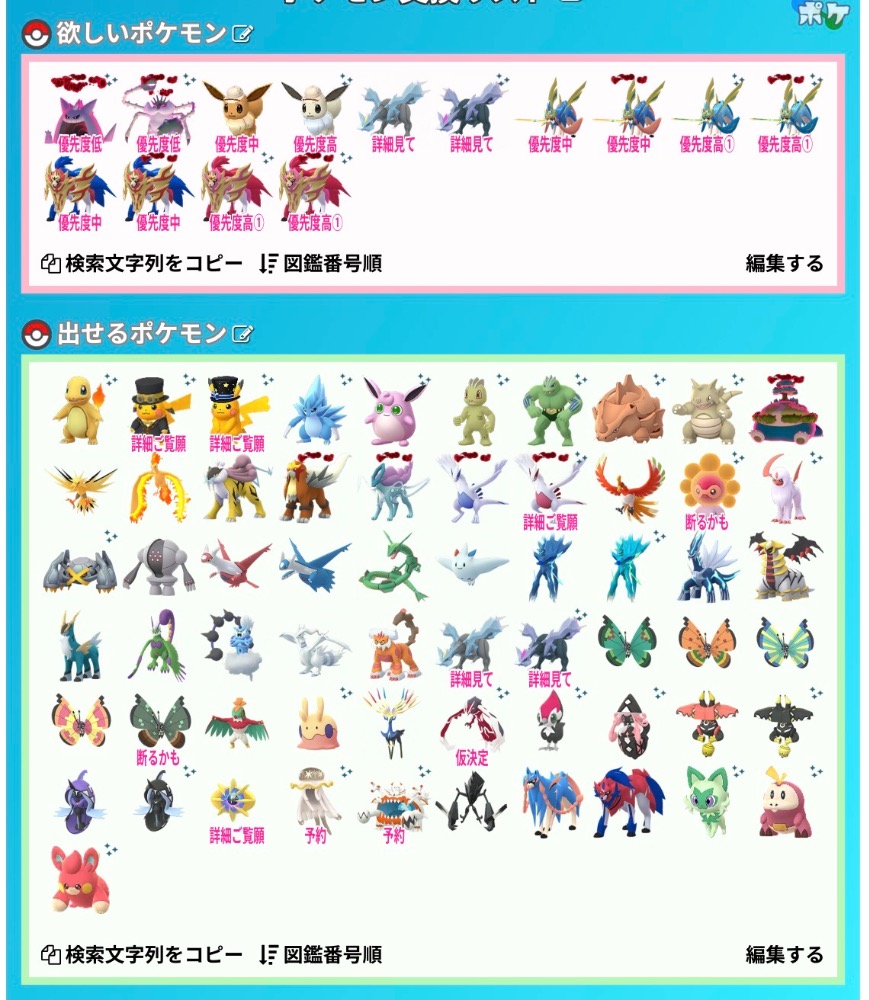 | コメント | どんどん欲しいポケモン書いていってください! 出せるポケモンと欲しいポケモンを最初に書いてくれるとありがたいです。 ロケカは持ってないです。 連絡はXかこの掲示板でお願いします。 |