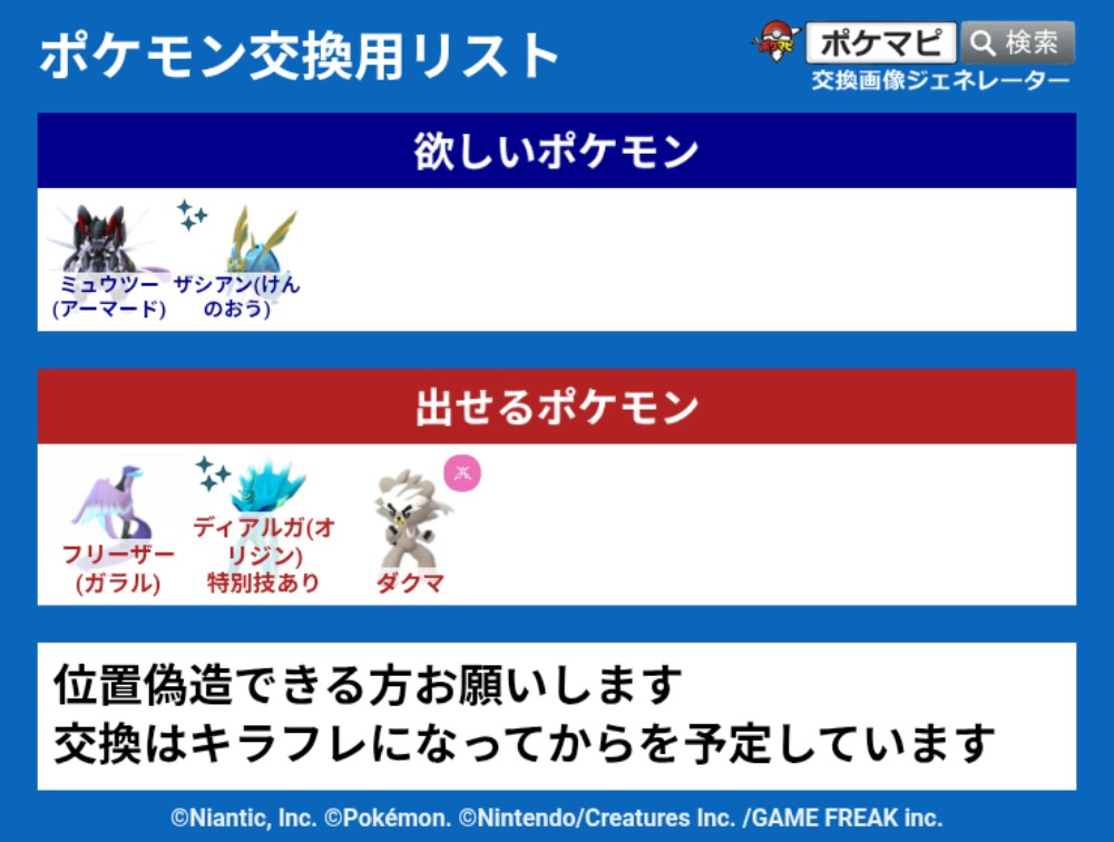 | コメント | 基本的には大親友+後のリモート交換希望ですがこちらまで来ていただけるのであればキラチャーム使用します(西日本) ザシザマはおうに変身済も可能です 画像以外のポケモンで欲しいポケモン、出せるポケモンいますのでお気軽に |