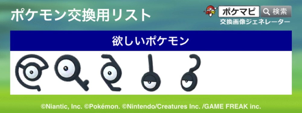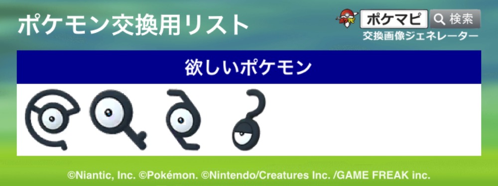 | コメント | 画像のアンノーン希望です! 主に野生の色違い、伝説色違いとの交換がいいですが、色コスは最近ので複数所持なら出せるかもしれないです |