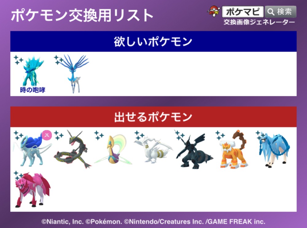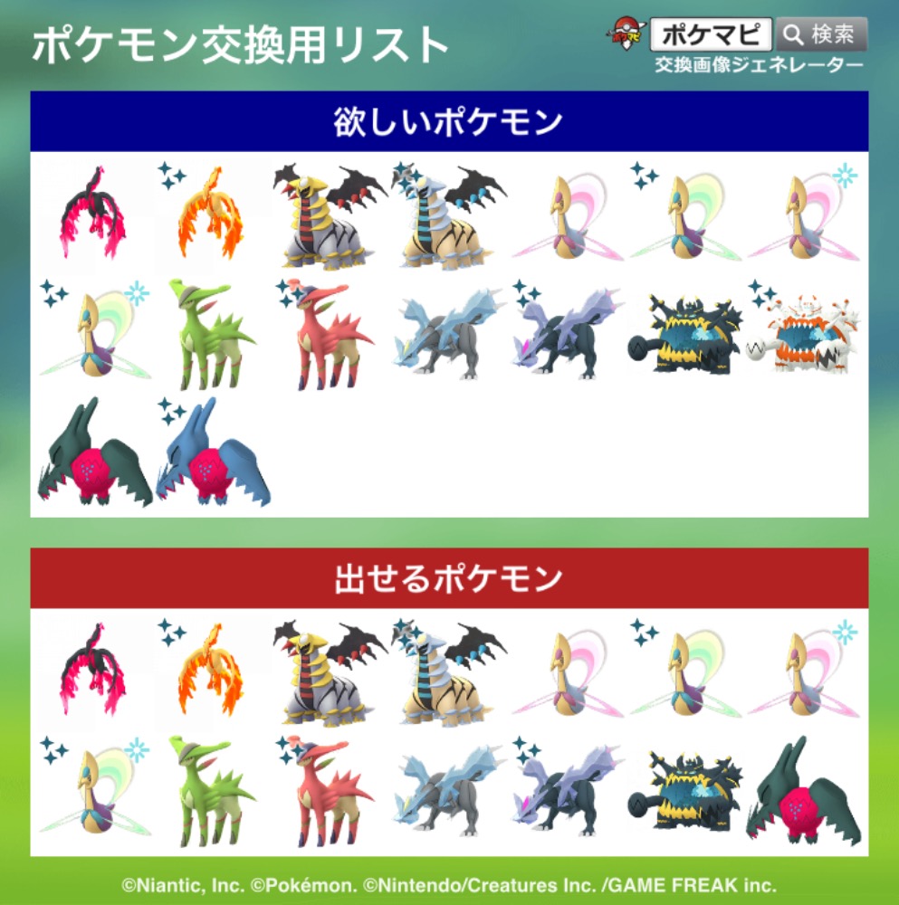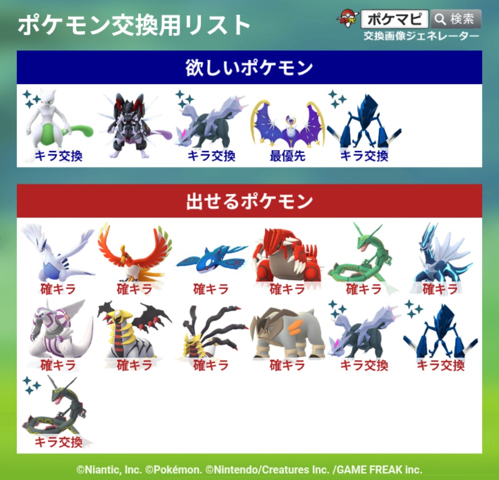| コメント | ミュウツー、グラードン、レックウザ、ホウオウ、ルギア、三鳥、はキラ確定交換可能 ギラティナアナザーフォルム、クレセリア、コバルオン、ビリジオンはgbl個体が欲しいです オリジンパルキアは亜空切断持ち個体のみ希望 |