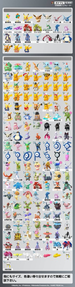 | コメント | 対面でも非対面でも大丈夫です○ 他にも色違いやサイズ系出せるポケモン居ますのでお気軽にお声かけ下さい。 Twitter等での相談も可能です。 |