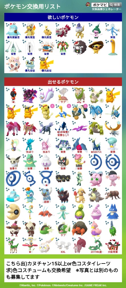 | コメント | ワイルドエリア長崎での交換募集です ワイルドエリア長崎後だと大阪、愛知、東京での交換が可能です 仮約束で大丈夫なのでもし可能な方いましたらよろしくお願いします🙇 |
