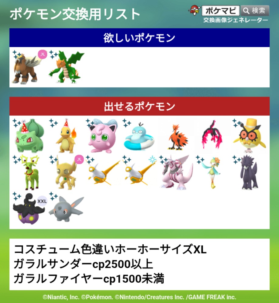 | コメント | お気軽にお声掛けください。ボール、性別にこだわりがありますので入っているボール、性別を教えて頂ければ幸いです。ガラルファイヤーはcp1500未満となっております。 |