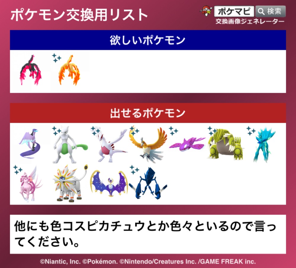 | コメント | 色ネクロズマはグローバル背景の相互交換求めます。色ガラルサンダーは要相談。 フレンドコード:796243250044 コメント返信又はキャンプファイヤーでの連絡お願いします。 |