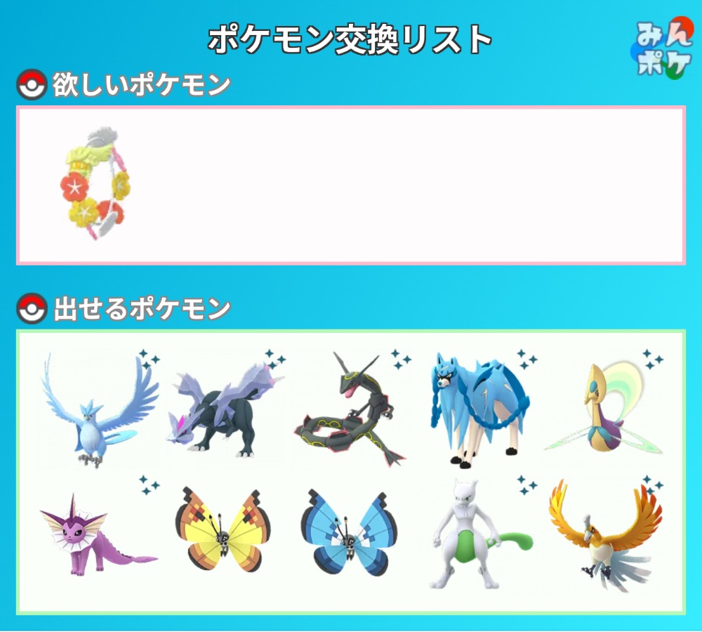 | コメント | 非対面で交換よろしくお願いします。 また、貴重なポケモンには数体交換にだしますので、よろしくお願いします。 |