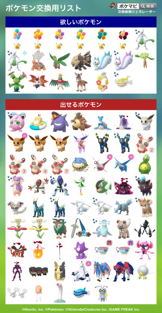 | コメント | ★非対面交換です ★欲しいポケモンはほとんどが図鑑未登録となります ★出せるポケモンから2体出すことも可能です ★色違いイーブイは進化させてから渡す事も可能です(ニンフィアは時間がかかります) 記入例:色イーブイ(シャワーズ) ★連絡方法は X、Gmail、Campfire、discord、LINEが可能です ※出せるポケモンはコメント欄にも貼っておきます 出せるポケモンは他にもいますので提案いただけるとありがたいです |