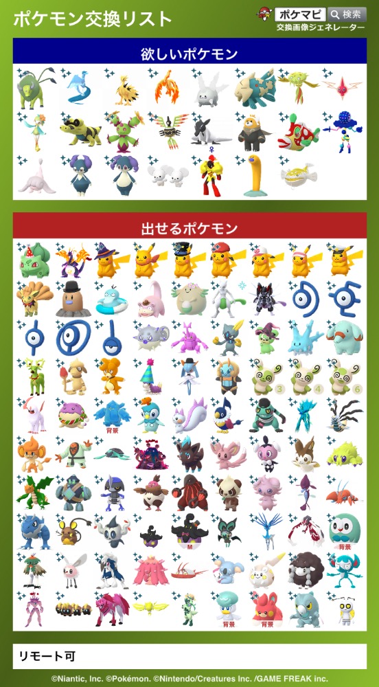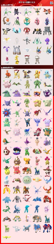 | コメント | 基本キラ交換でお願いします! リストのポケモン、キラ確ポケモン、他色違いなど提案お願いします! 他にも出せるポケモンいると思うので、希望があれば気軽に相談お願いします! ポケモンによっては技、強化をお願いする場合があります |