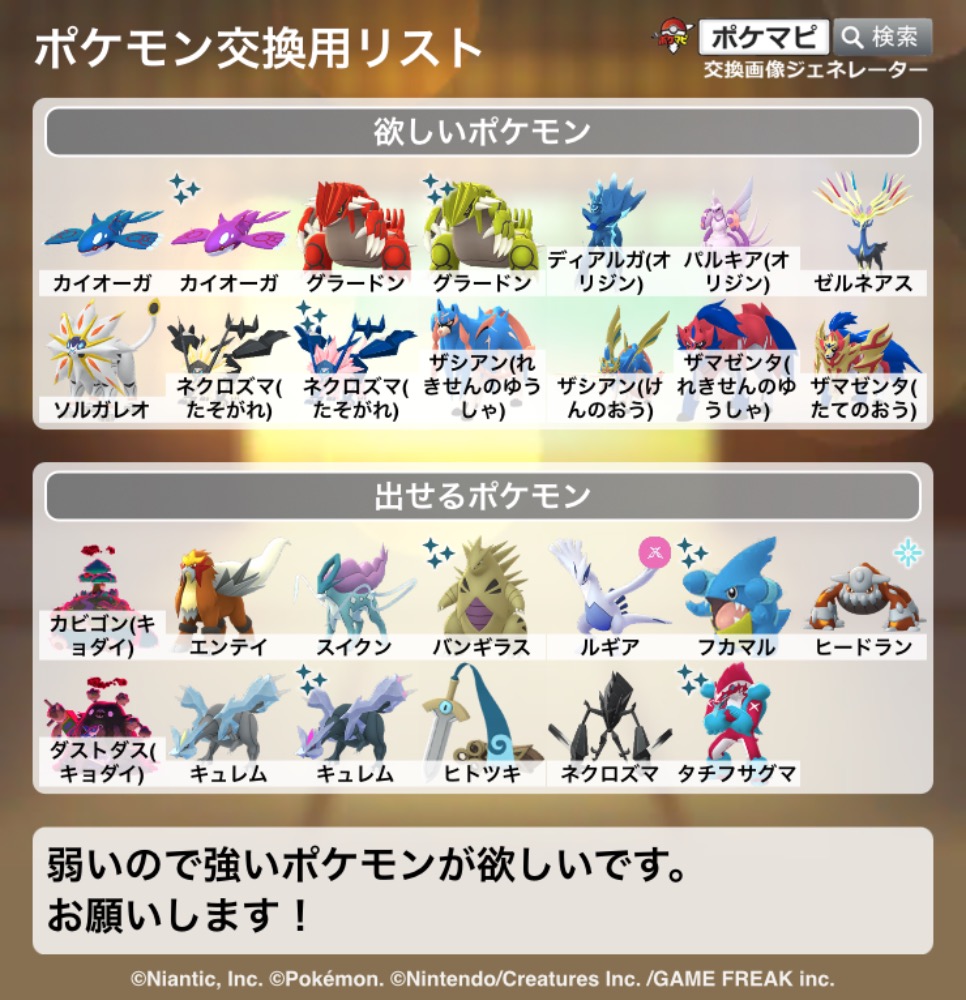 | 出せるポケモン | 色背景ネクロズマ 色クレセリア(2019産) アーマードミュウツー(2019産) 色ゼルネアス ザマゼンタ(XXL) 色ザシアン(けんのおう、CP5505)←これは複数との交換のみです その他諸々の伝説、色伝説 |